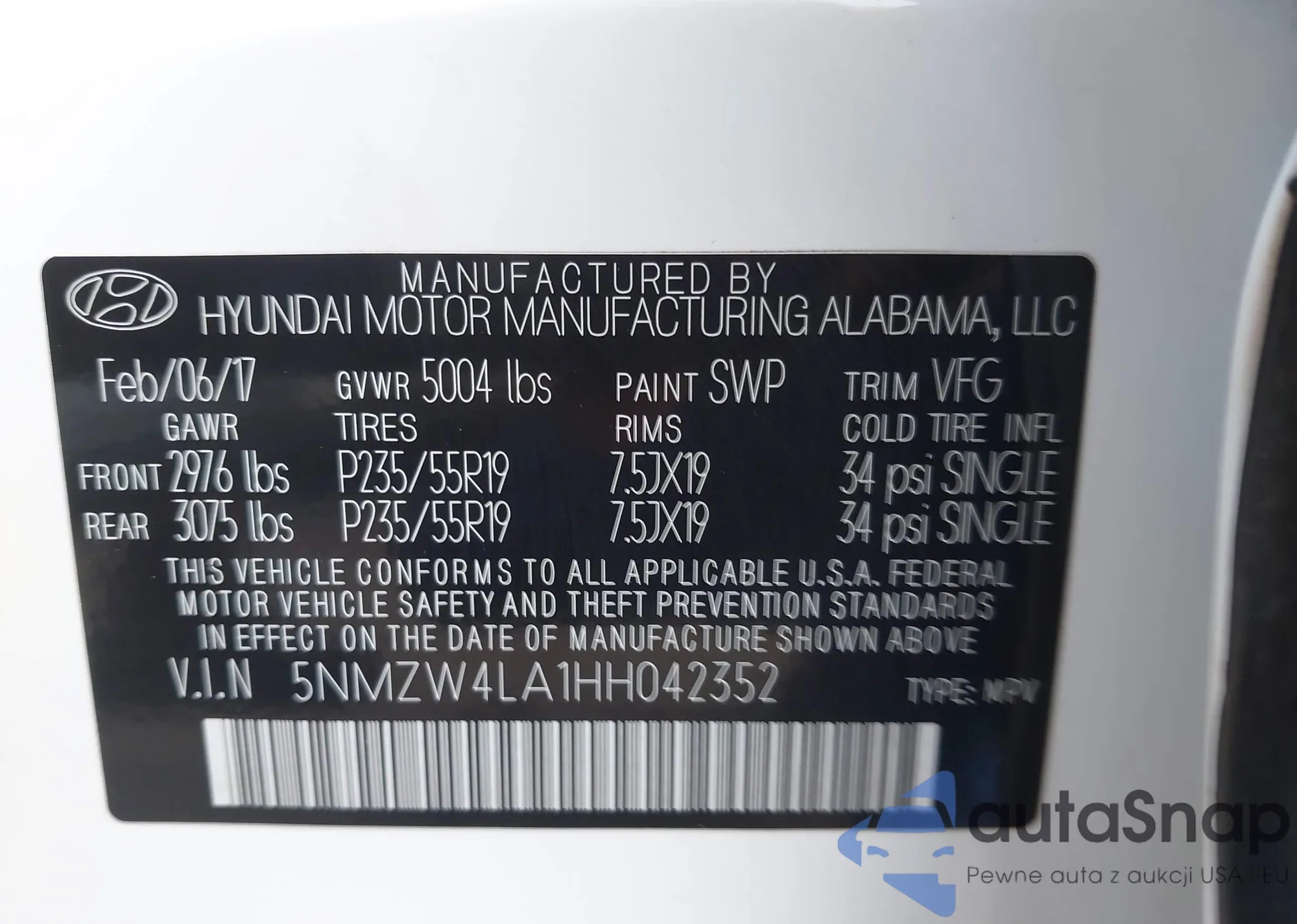 • VIN 5NMZW4LA1HH042352