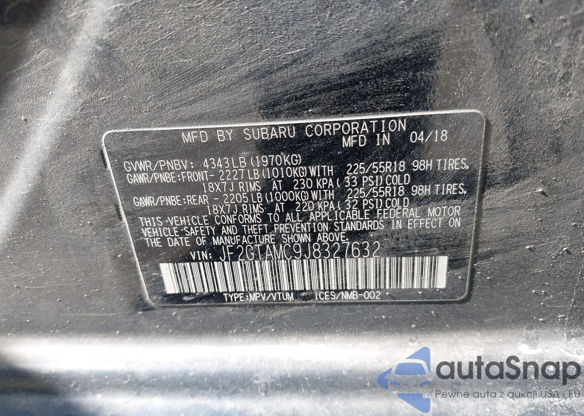 LOT: 43413571 VIN: JF2GTAMC9J8327632