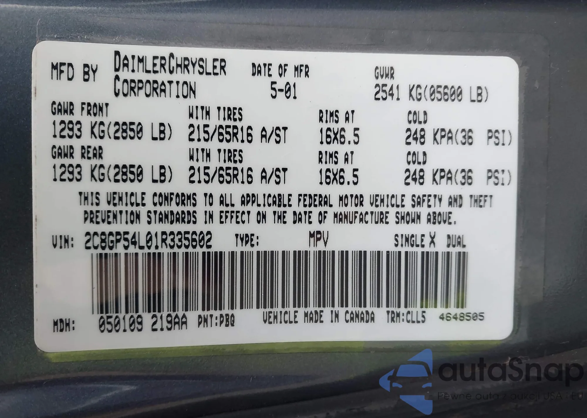 • VIN 2C8GP54L01R335602