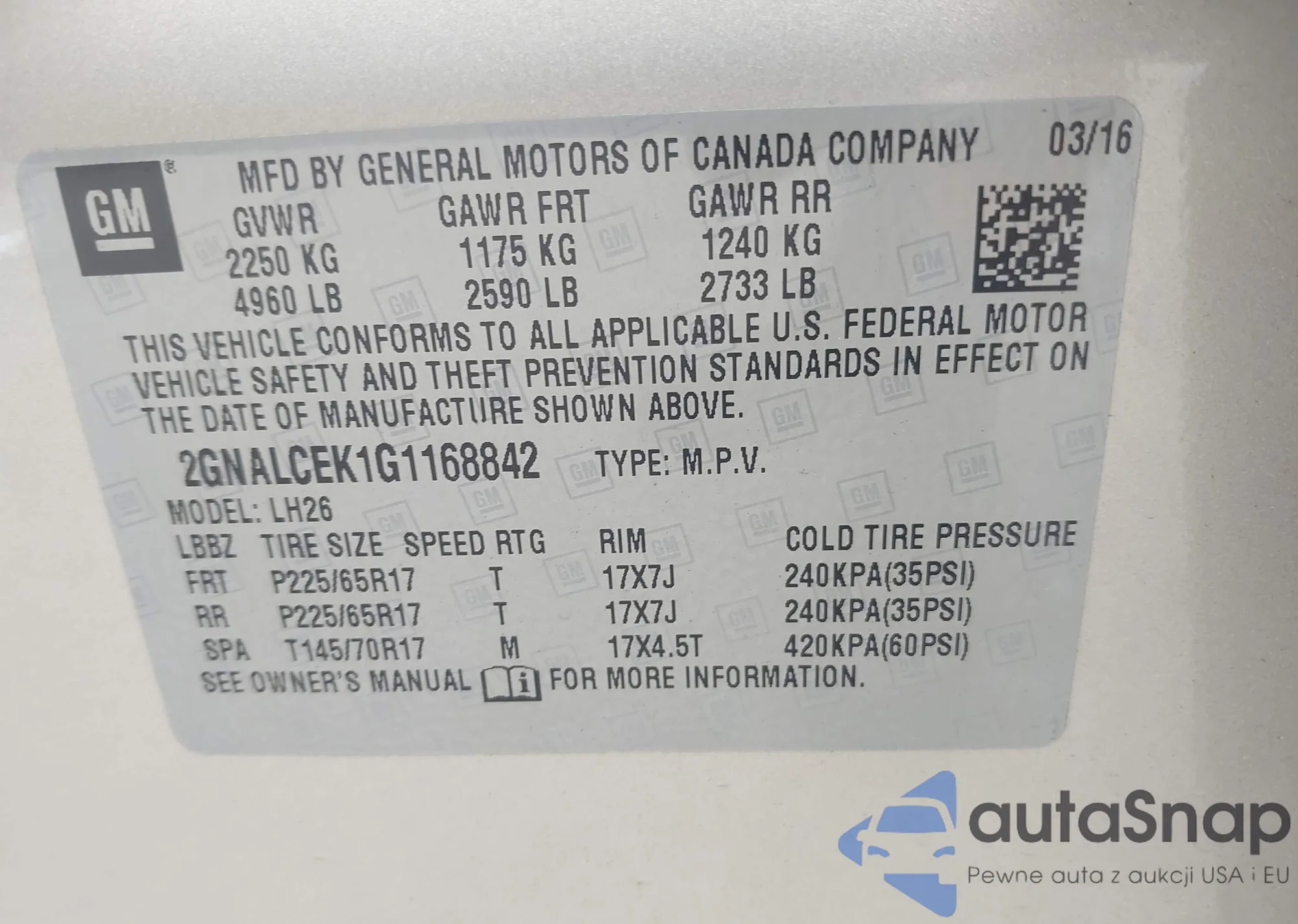 LOT: 42840791 VIN: 2GNALCEK1G1168842