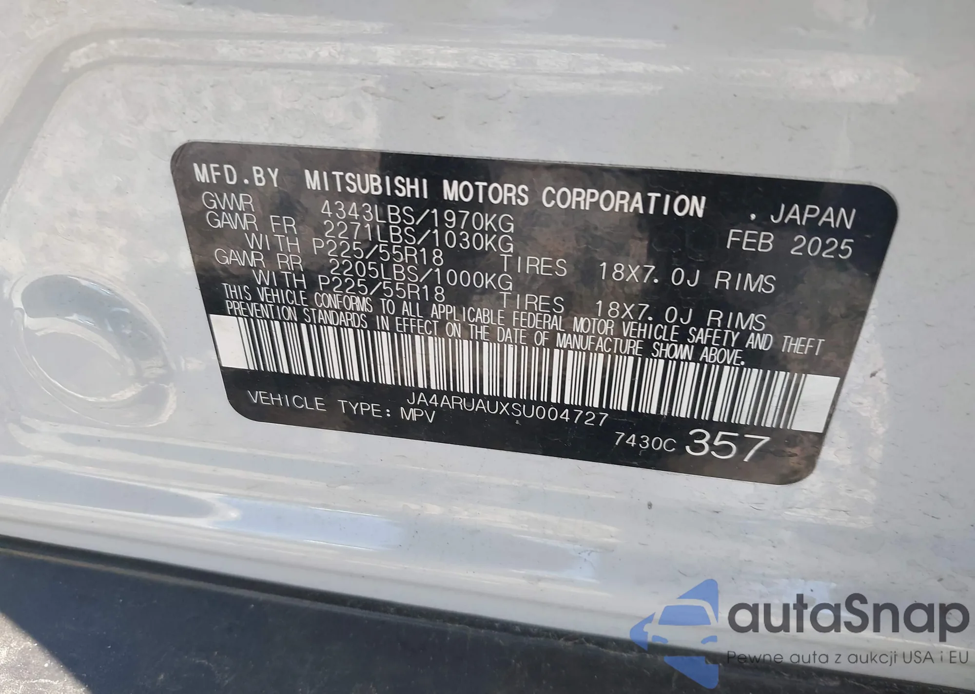 LOT: 43606603 VIN: JA4ARUAUXSU004727