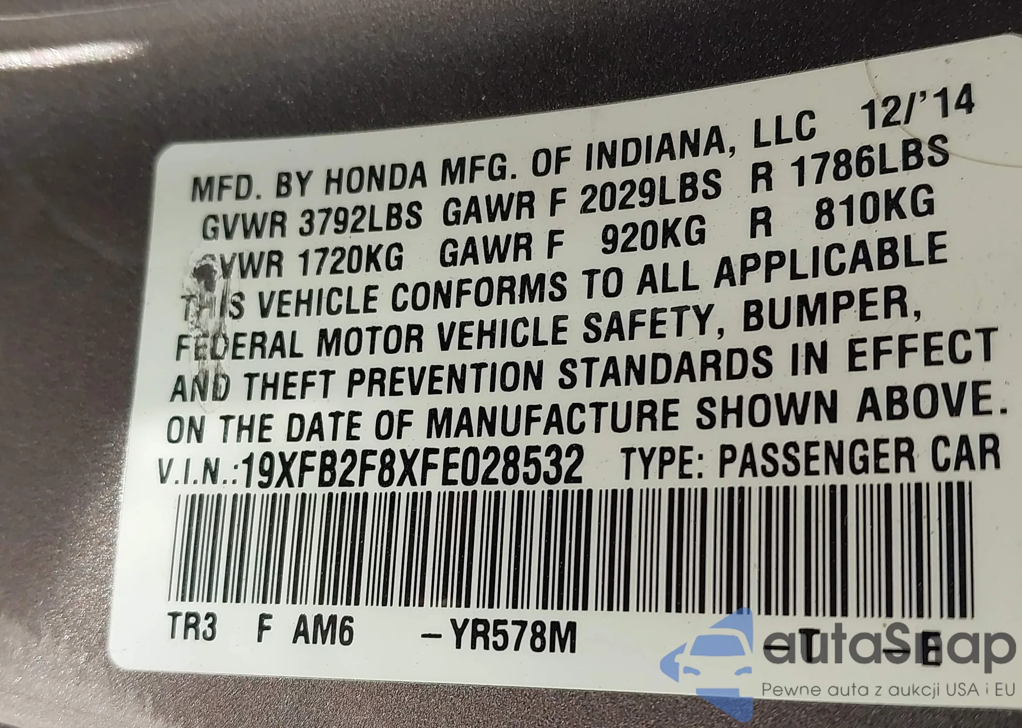 LOT: 43532384 VIN: 19XFB2F8XFE028532