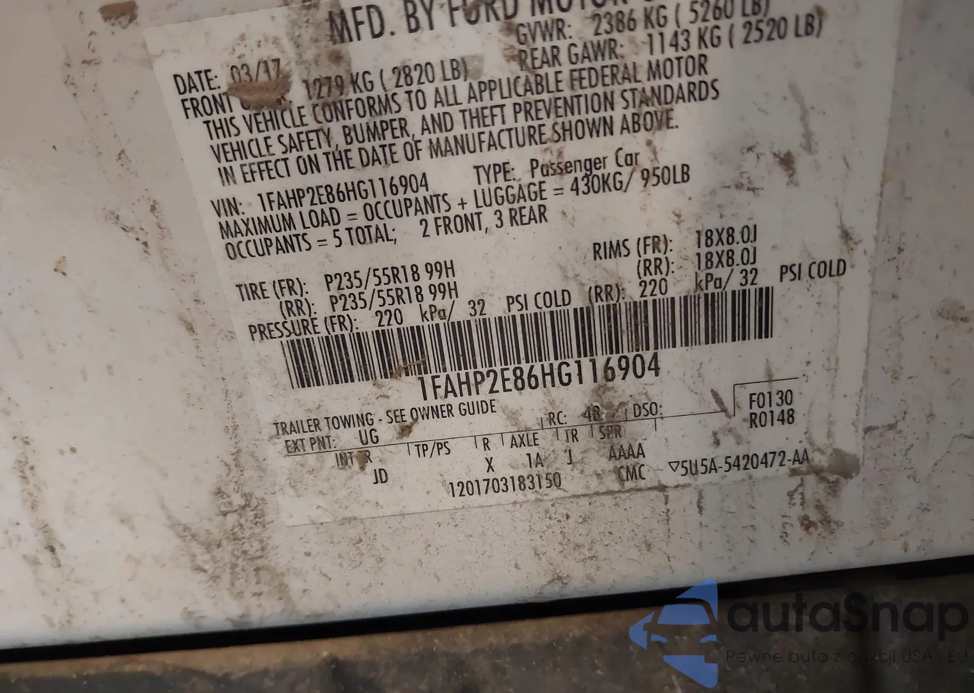 LOT: 43152326 VIN: 1FAHP2E86HG116904