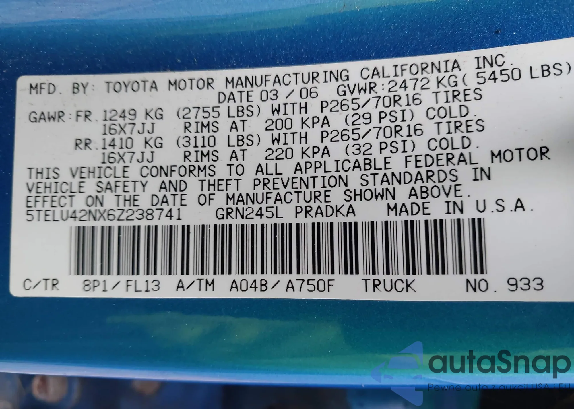 • VIN 5TELU42NX6Z238741