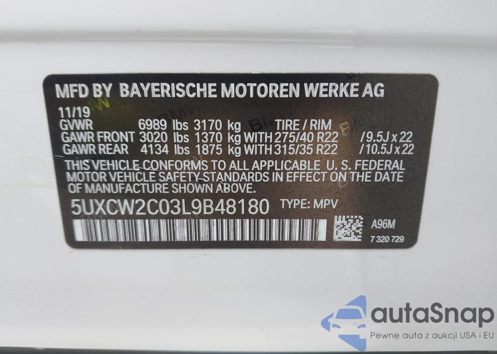LOT: 43320104 VIN: 5UXCW2C03L9B48180