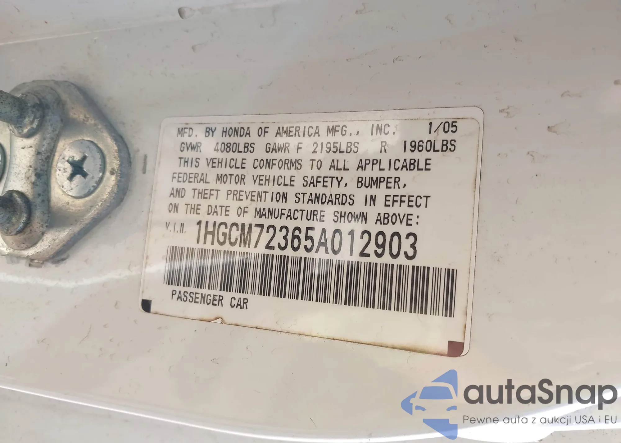 • VIN 5J6RE3H78AL041496