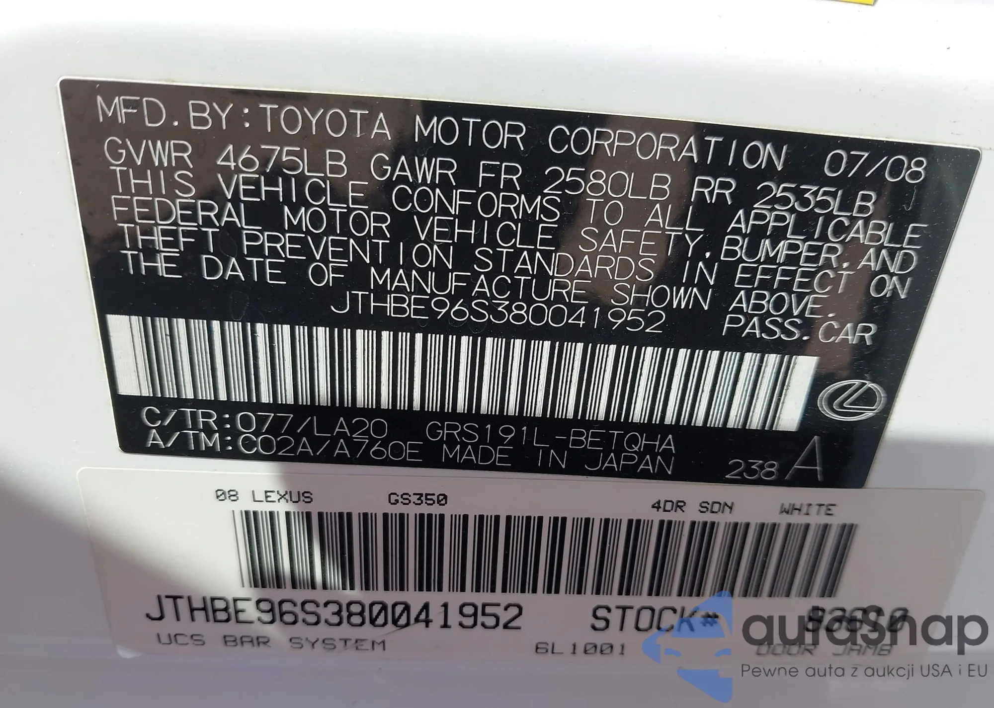 • VIN JTHBE96S380041952