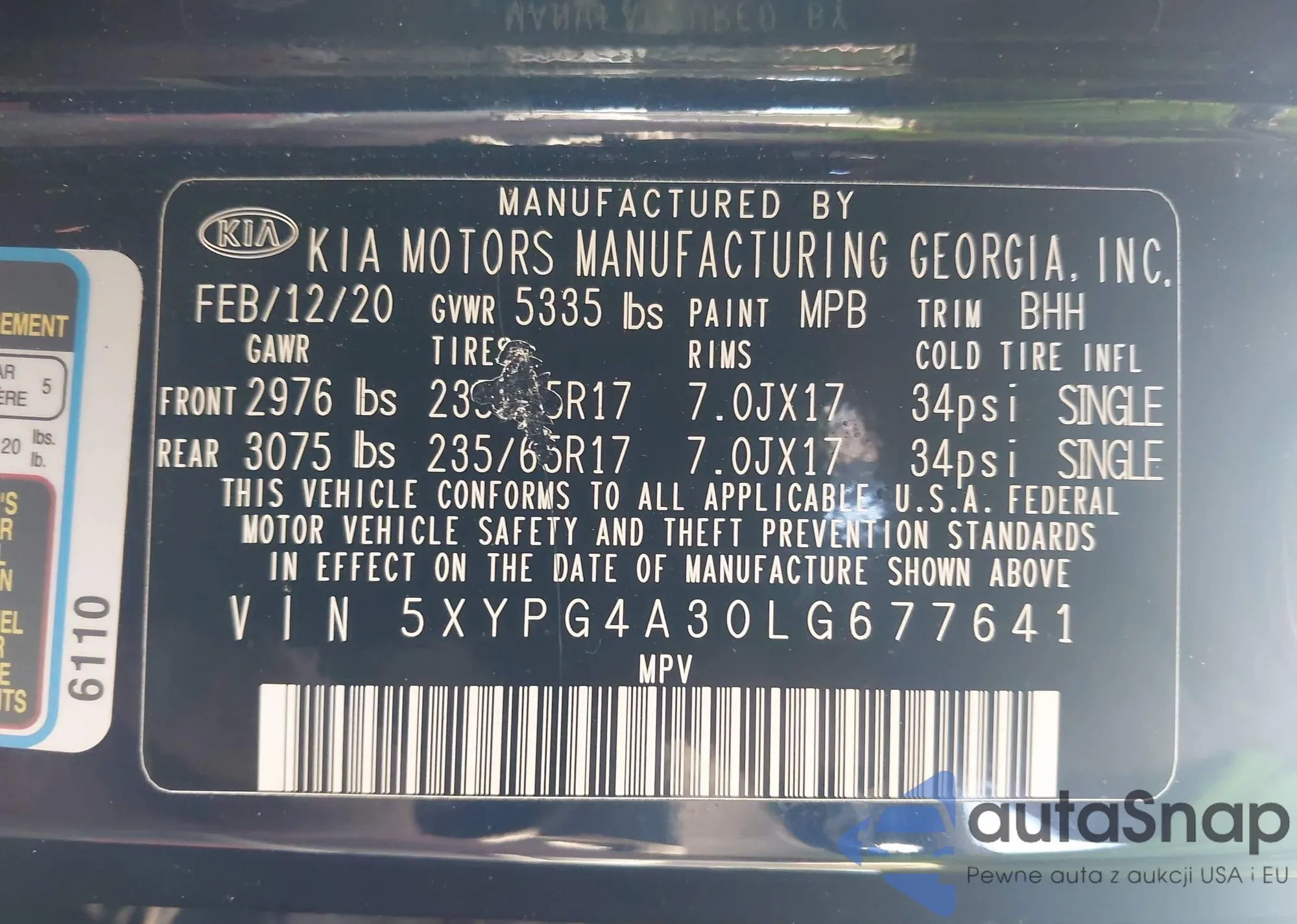 LOT: 43162265 VIN: 5XYPG4A30LG677641
