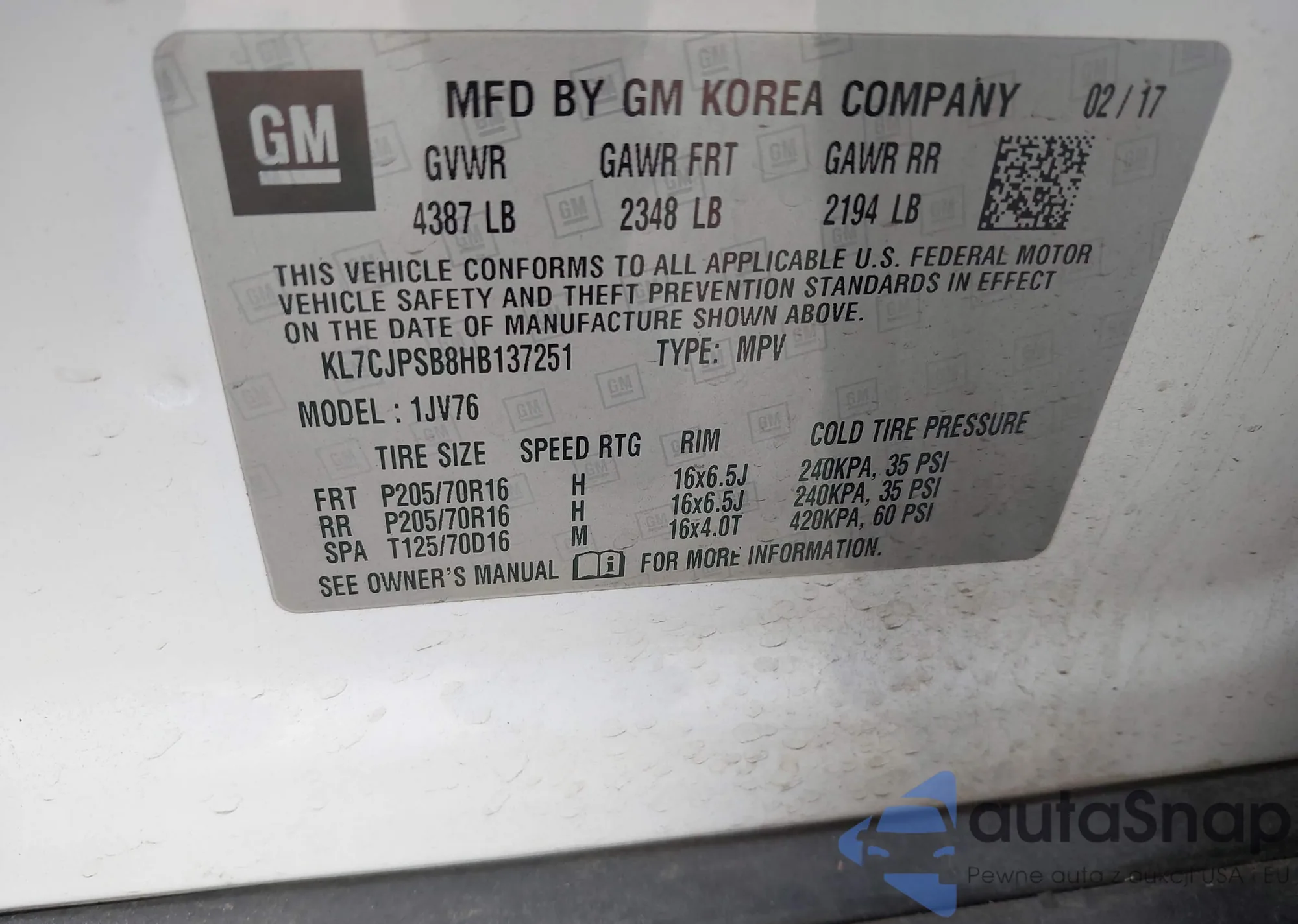 • VIN KL7CJPSB8HB137251