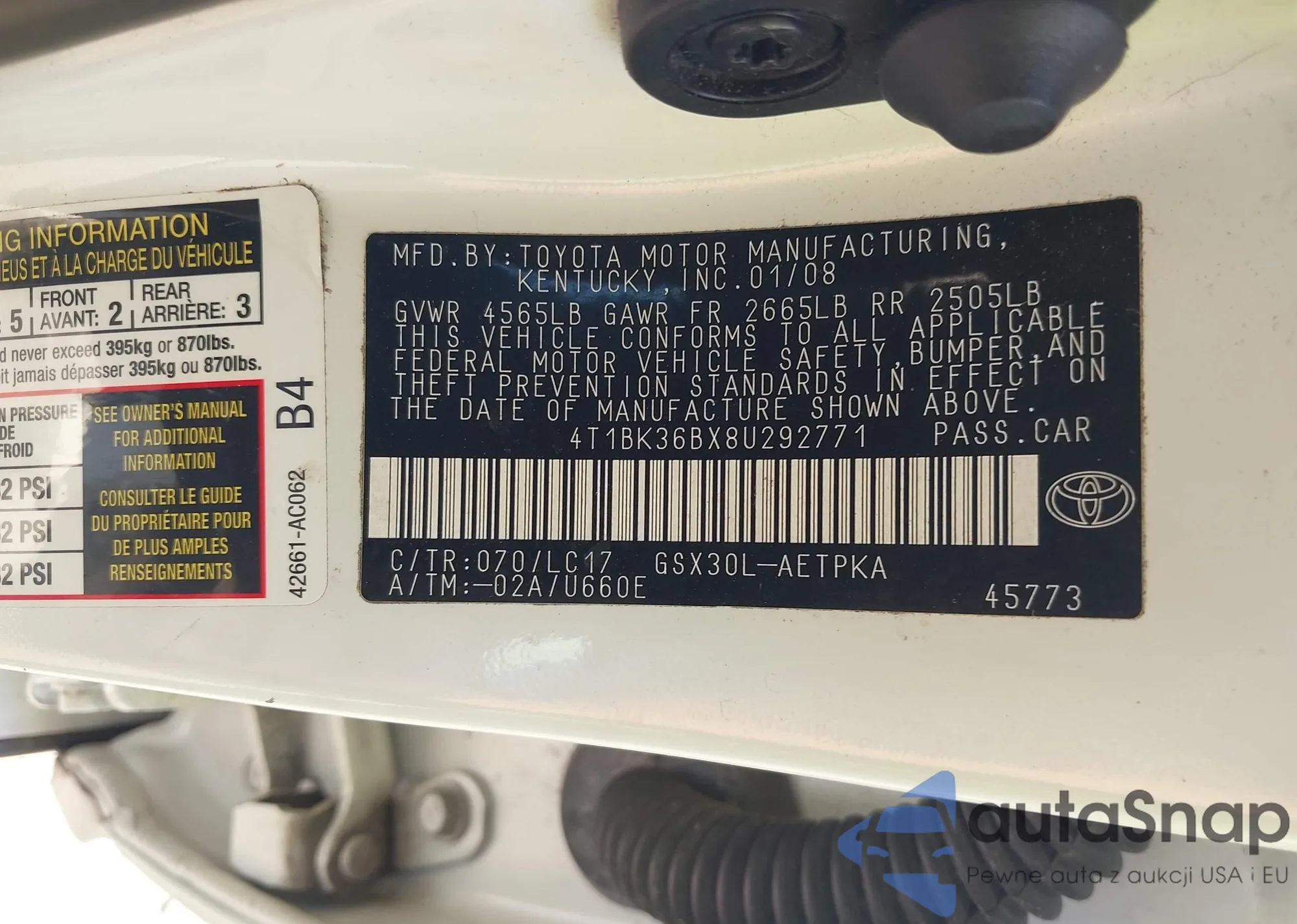 LOT: 43371195 VIN: 4T1BK36BX8U292771