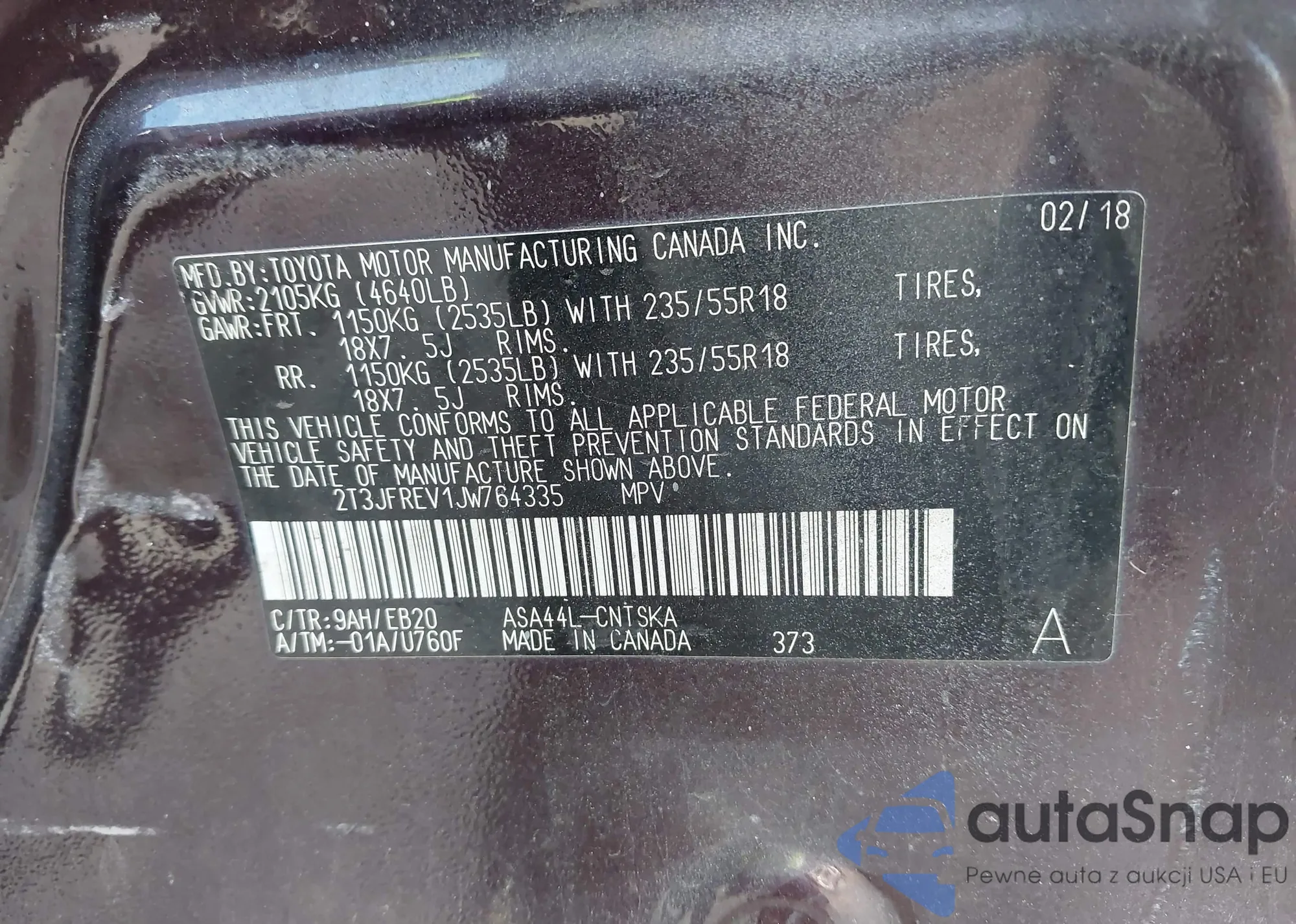 LOT: 43343670 VIN: 2T3JFREV1JW764335