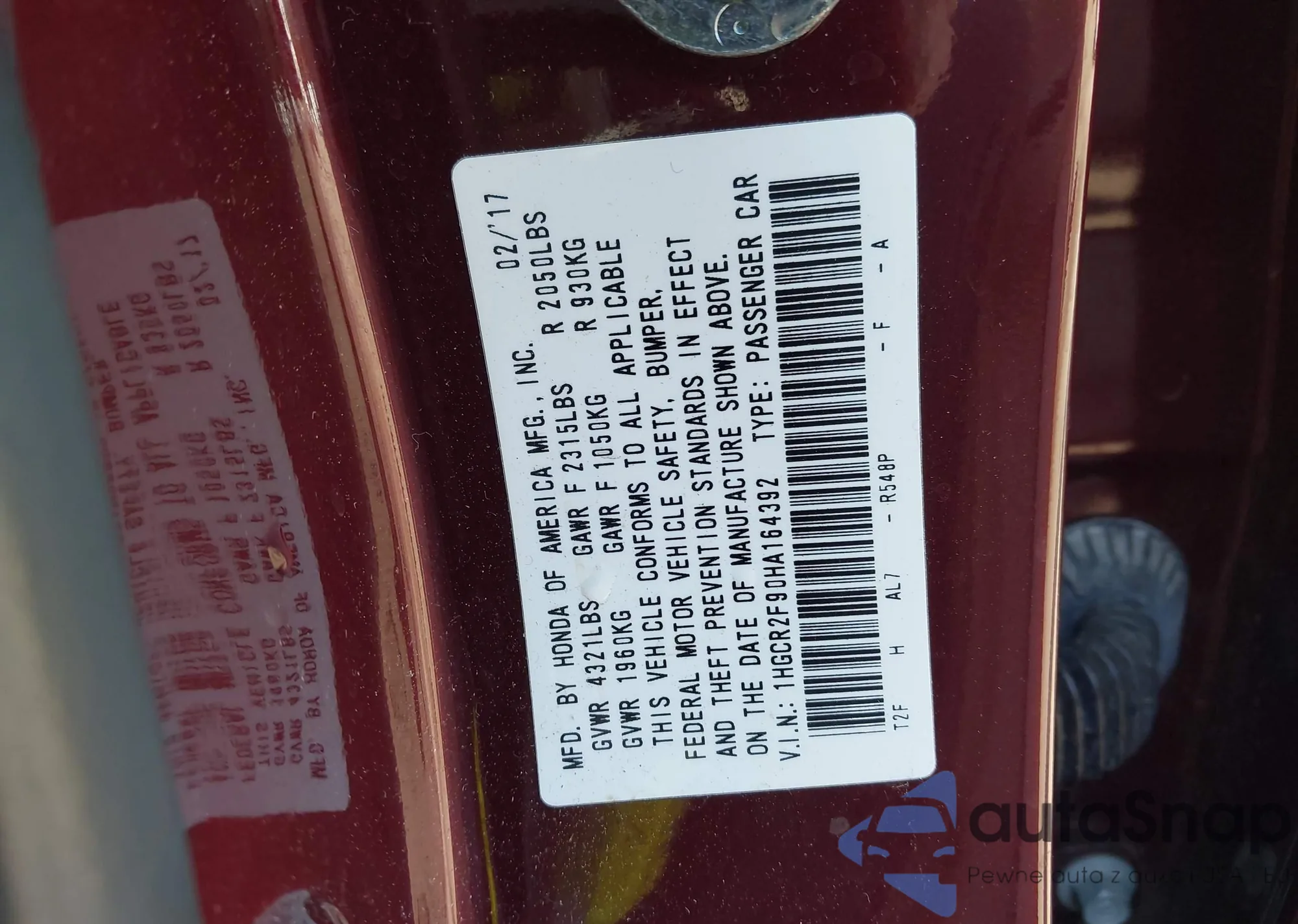 LOT: 43368455 VIN: 1HGCR2F90HA164392