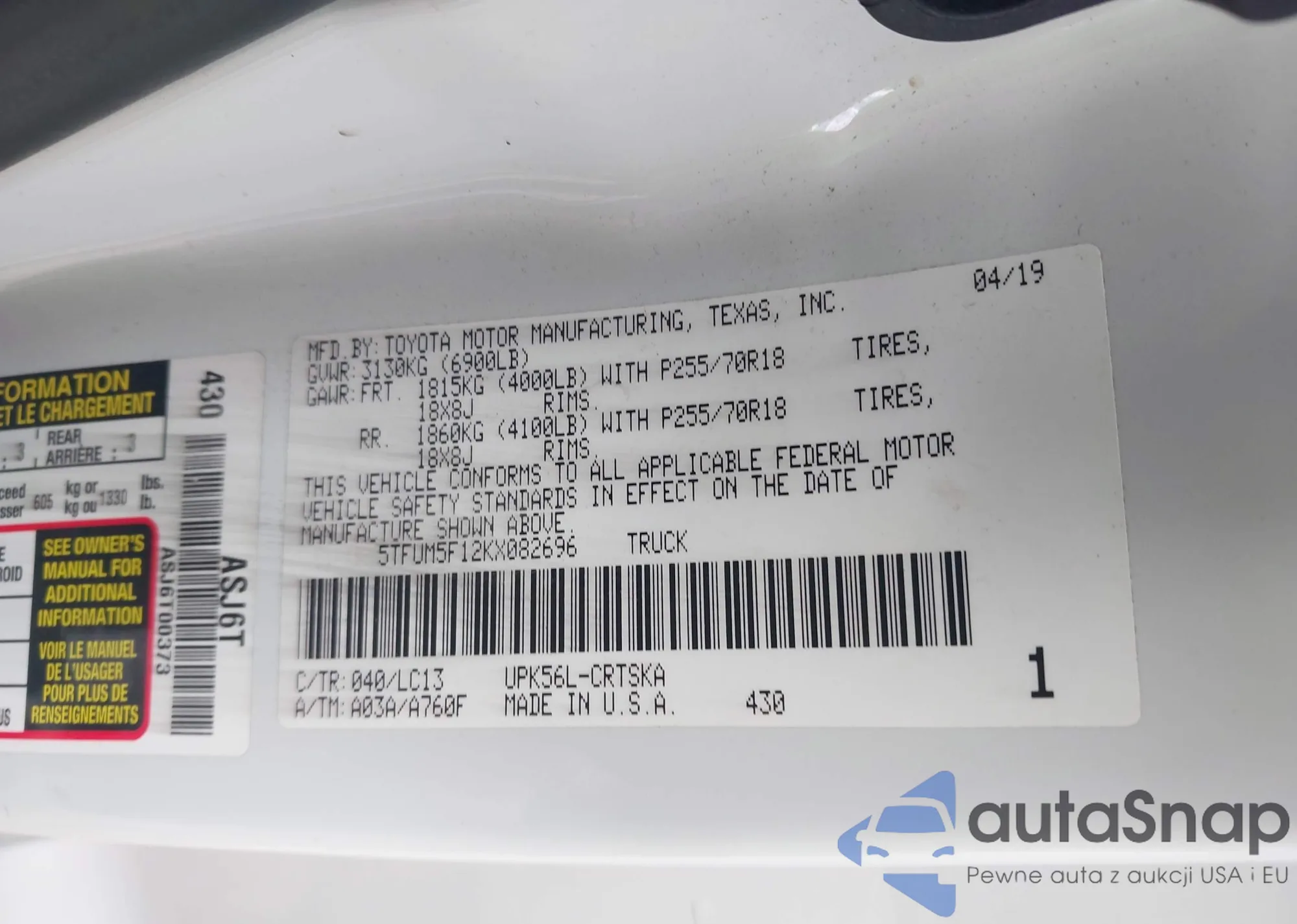LOT: 43491922 VIN: WP1AA2A54KLB00934
