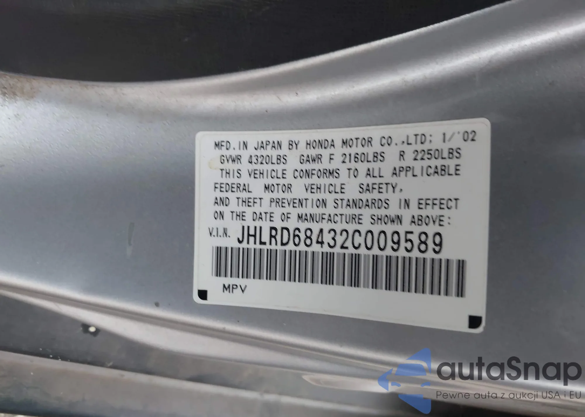 LOT: 43425005 VIN: JHLRD68432C009589