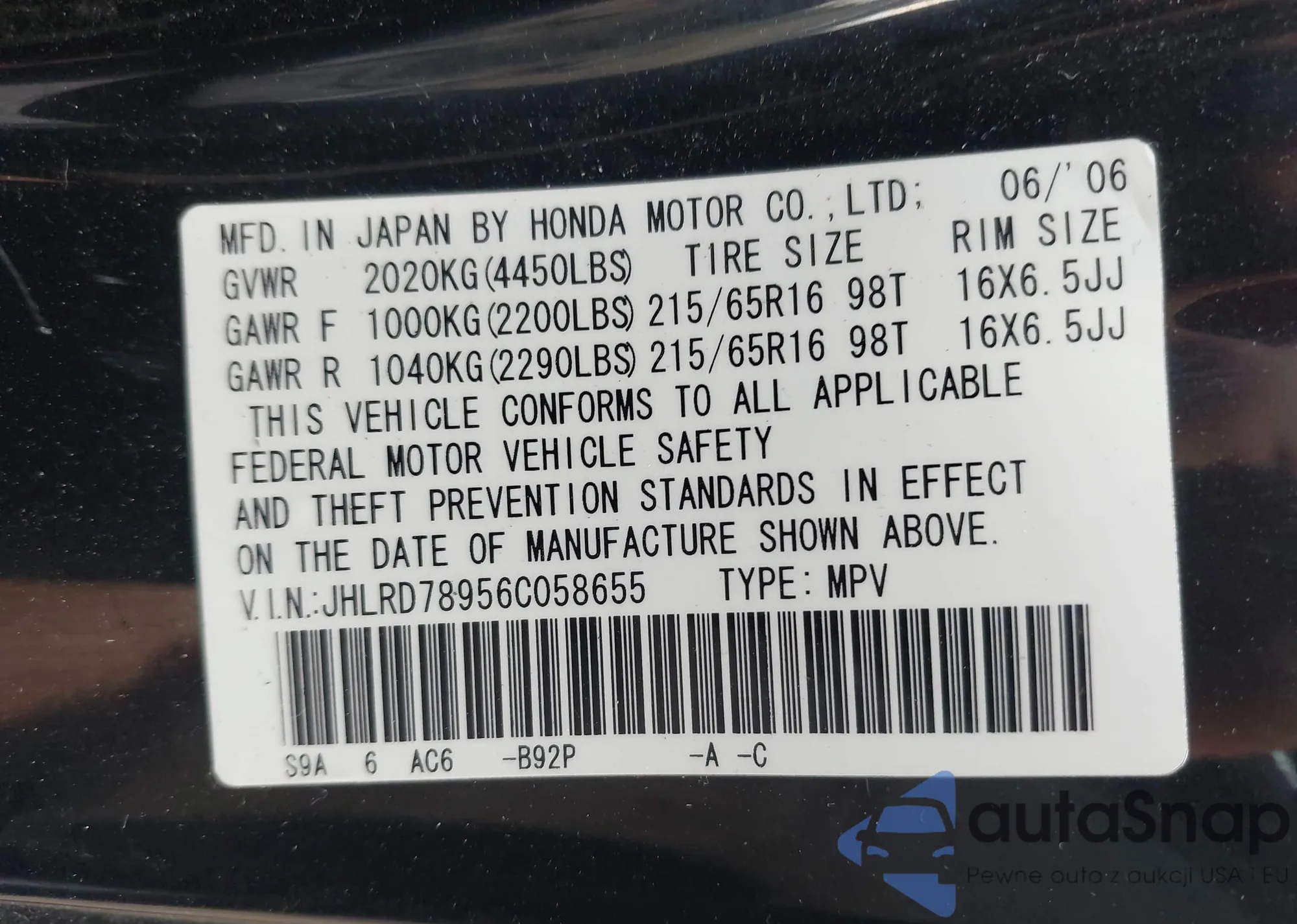 • VIN JHLRD78956C058655