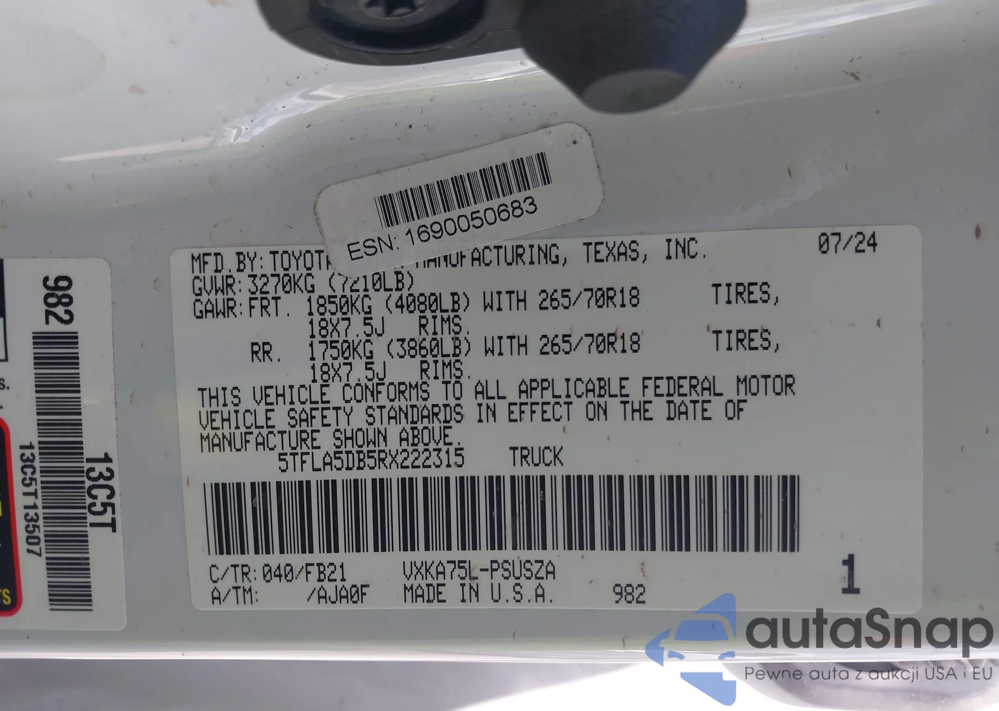 • VIN 5TFLA5DB5RX222315