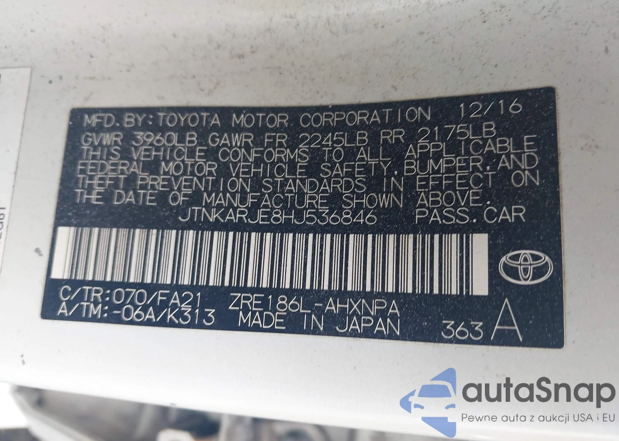 LOT: 42968637 VIN: JTNKARJE8HJ536846