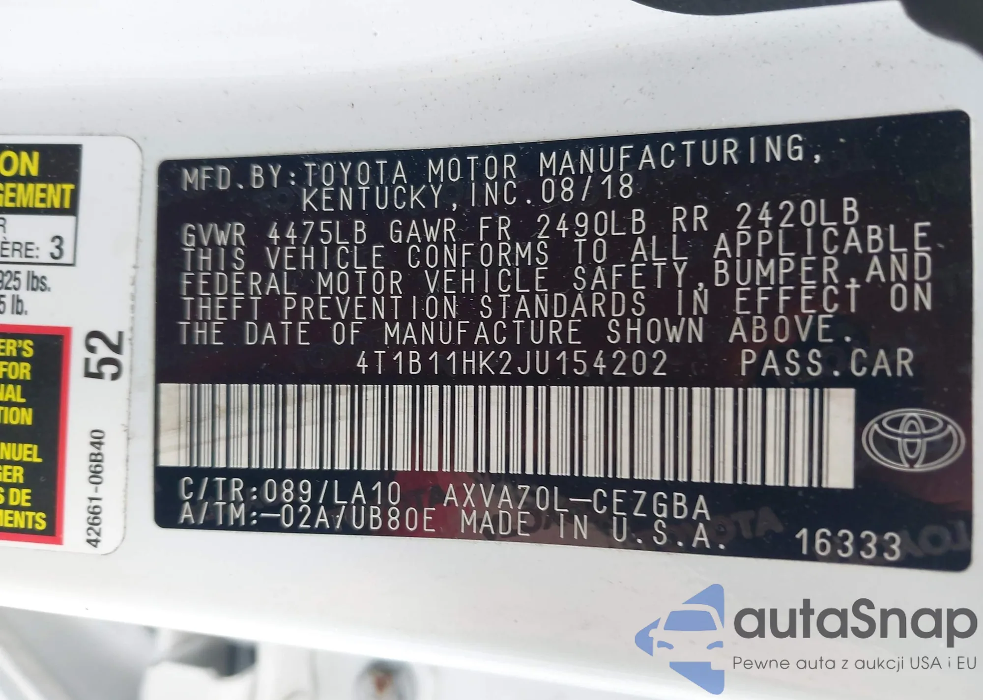 LOT: 43129253 VIN: 4T1B11HK2JU154202