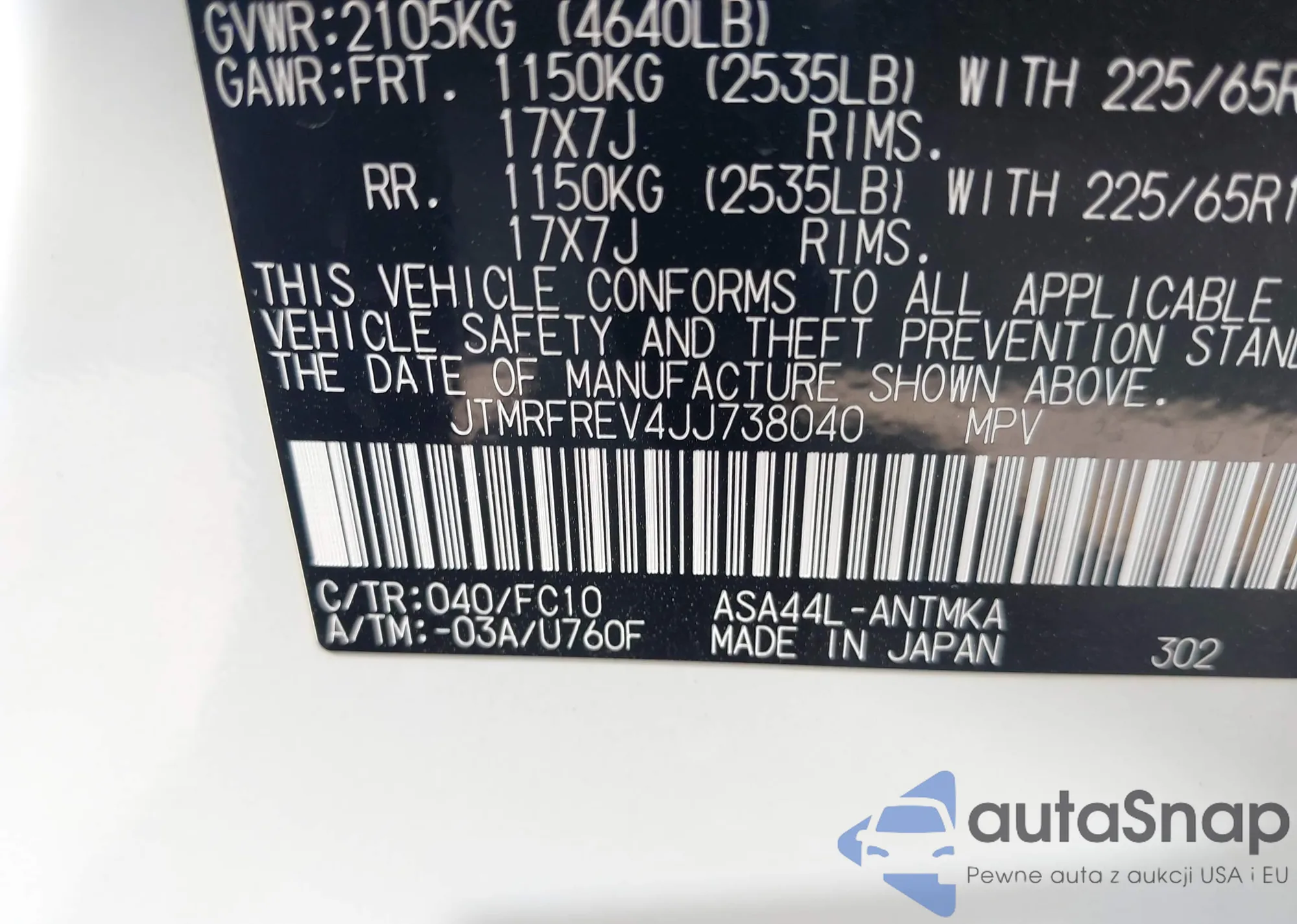 LOT: 43401852 VIN: JTMRFREV4JJ738040