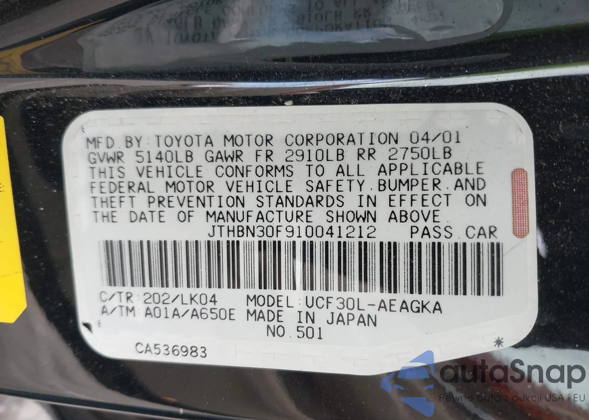 LOT: 43259645 VIN: JTHBN30F910041212