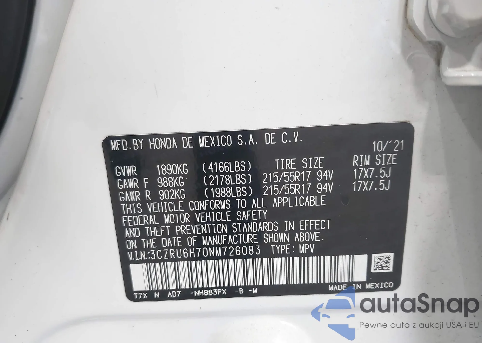 • VIN 3CZRU6H70NM726083