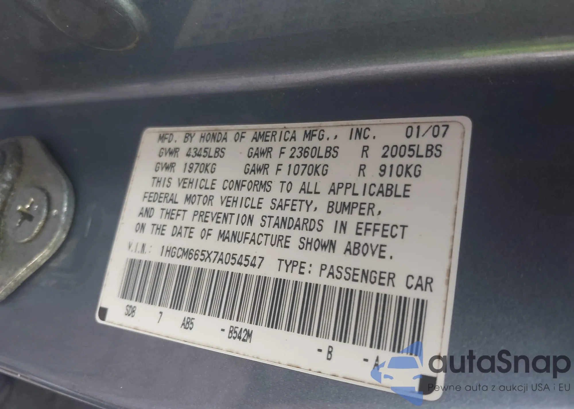 LOT: 43304150 VIN: 1HGCM665X7A054547