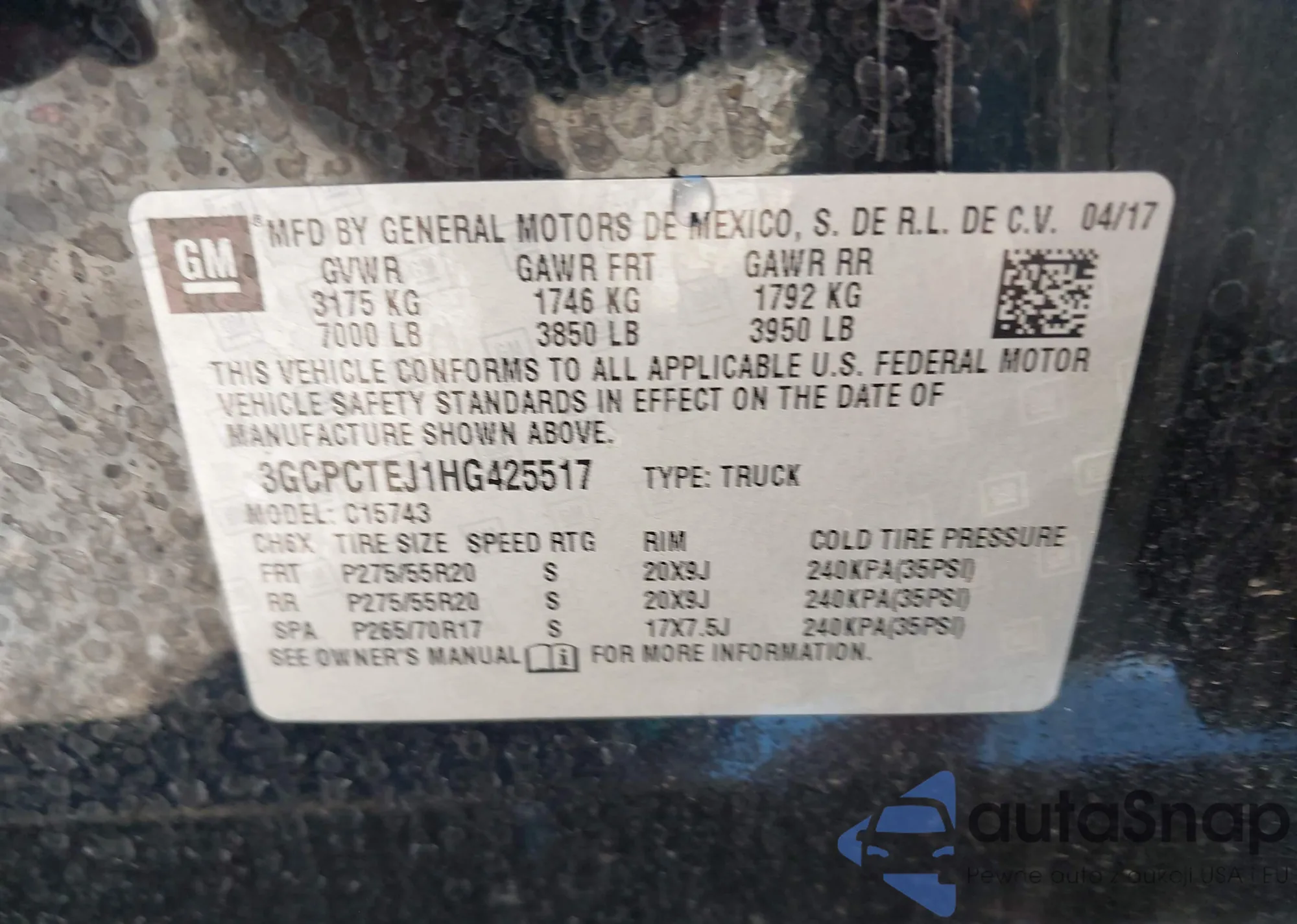 LOT: 43489840 VIN: 3GCPCTEJ1HG425517