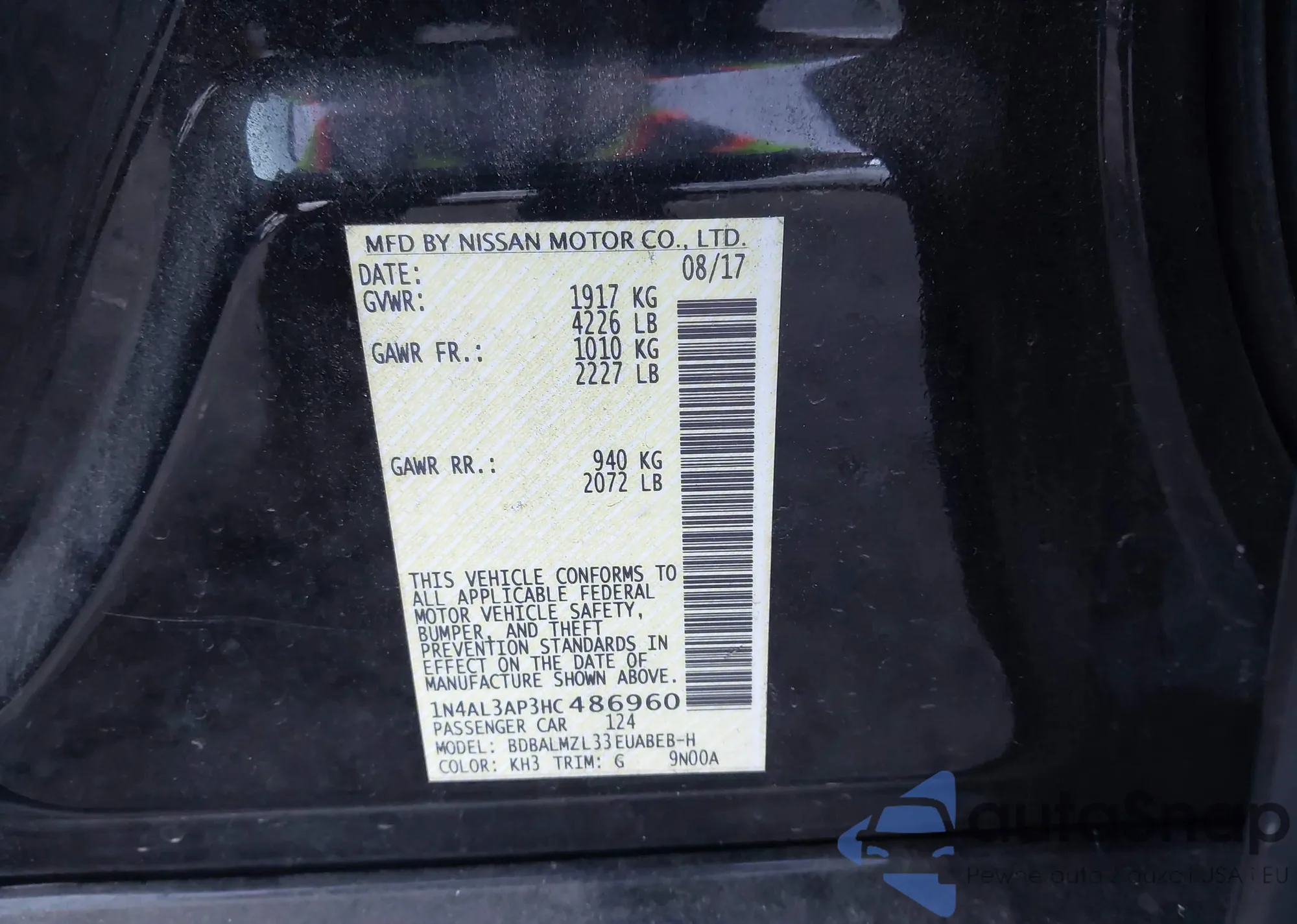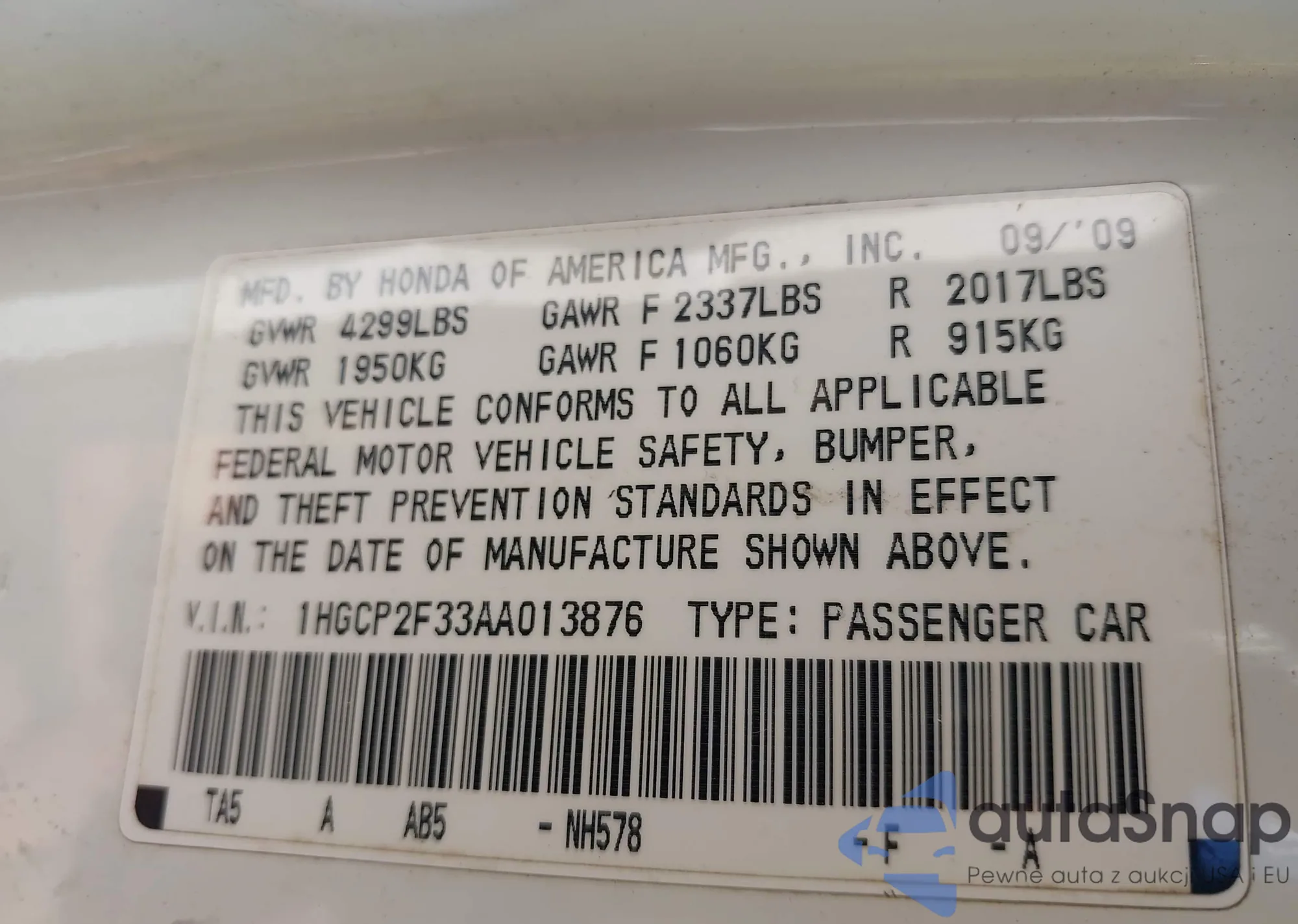 LOT: 43318218 VIN: 1HGCP2F33AA013876