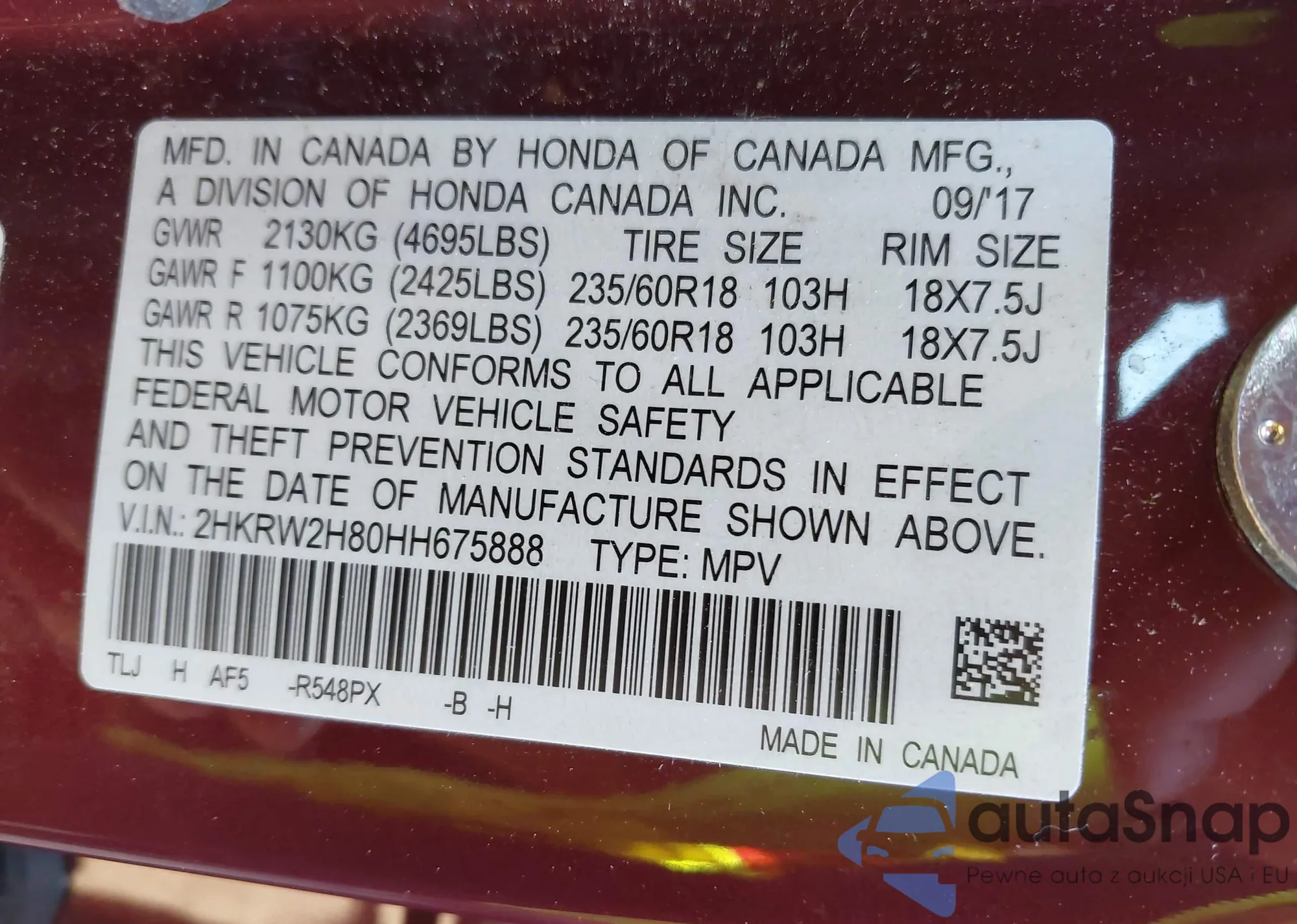 • VIN 2HKRW2H80HH675888