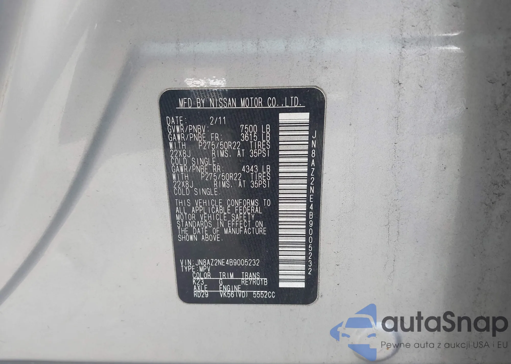 • VIN JN8AZ2NE4B9005232