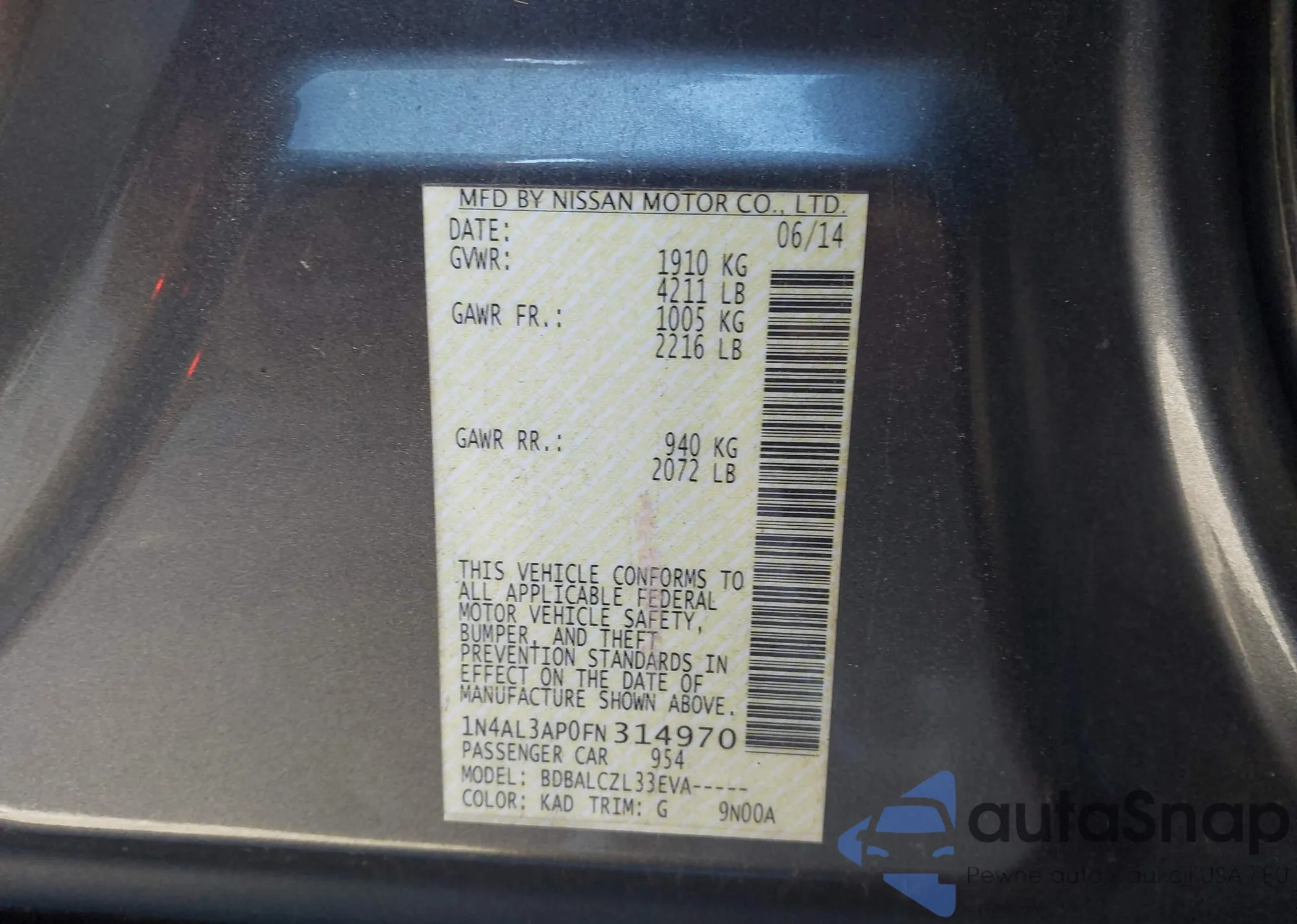 LOT: 43615405 VIN: 1N4AL3AP0FN314970
