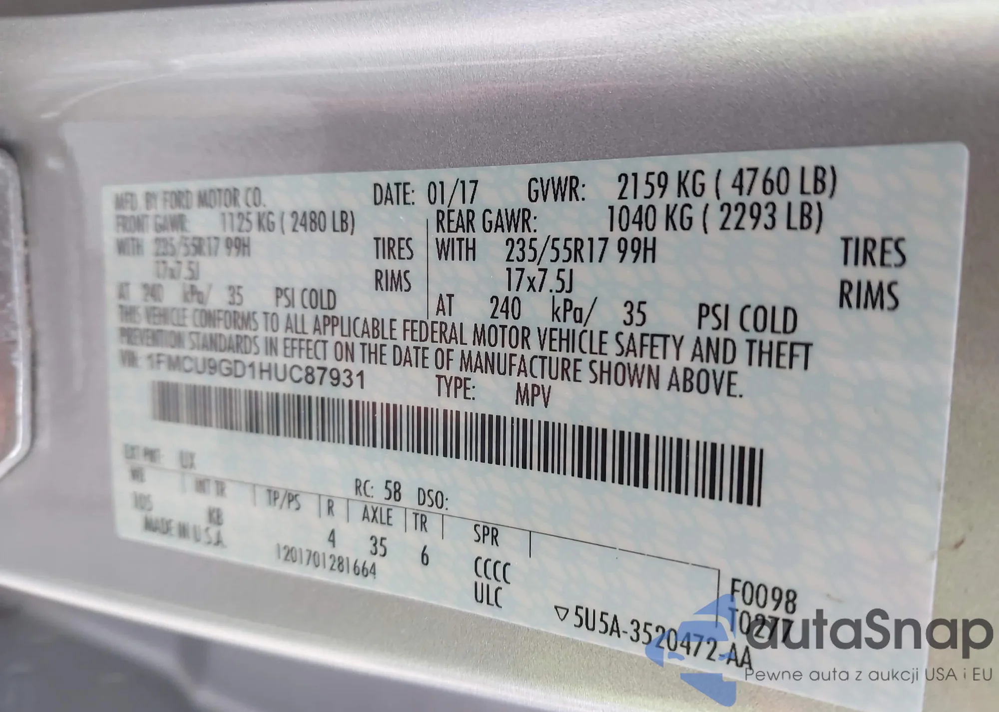 LOT: 43714241 VIN: 1FMCU9GD1HUC87913