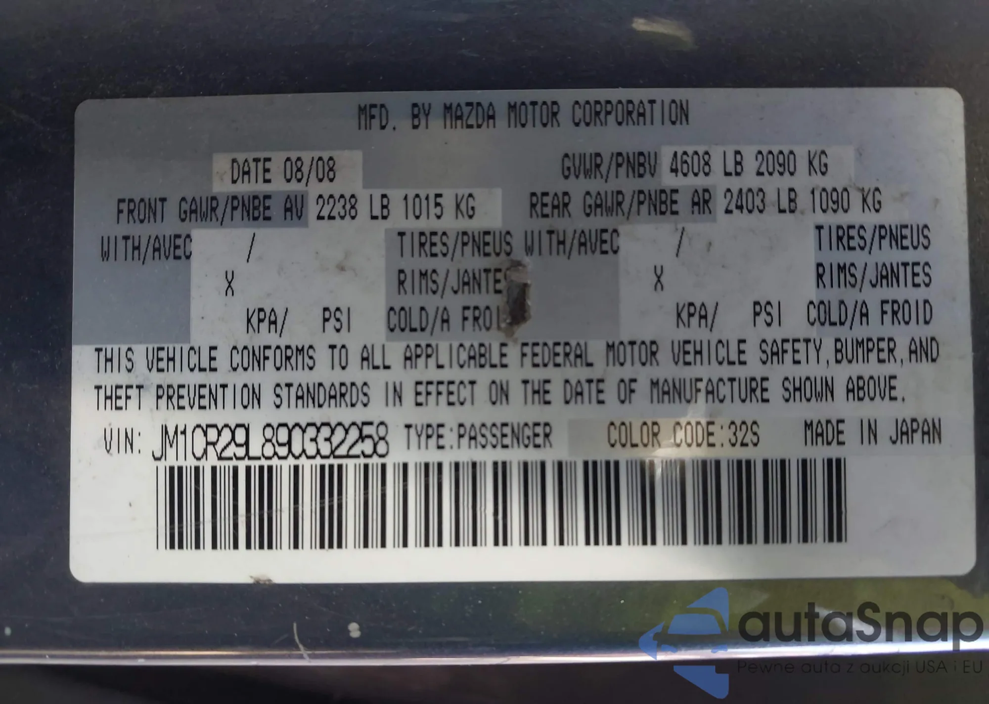 LOT: 43608750 VIN: JM1CR29L890332258