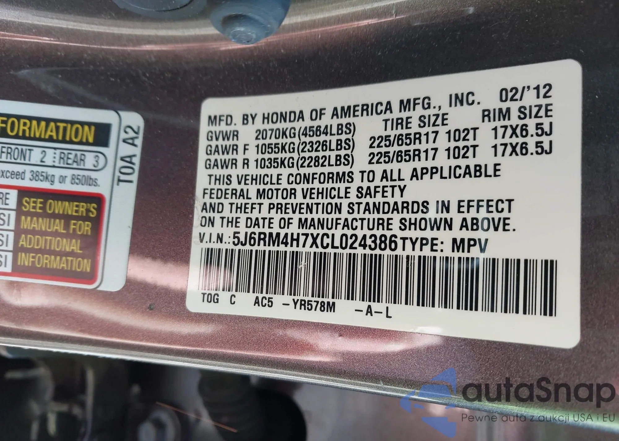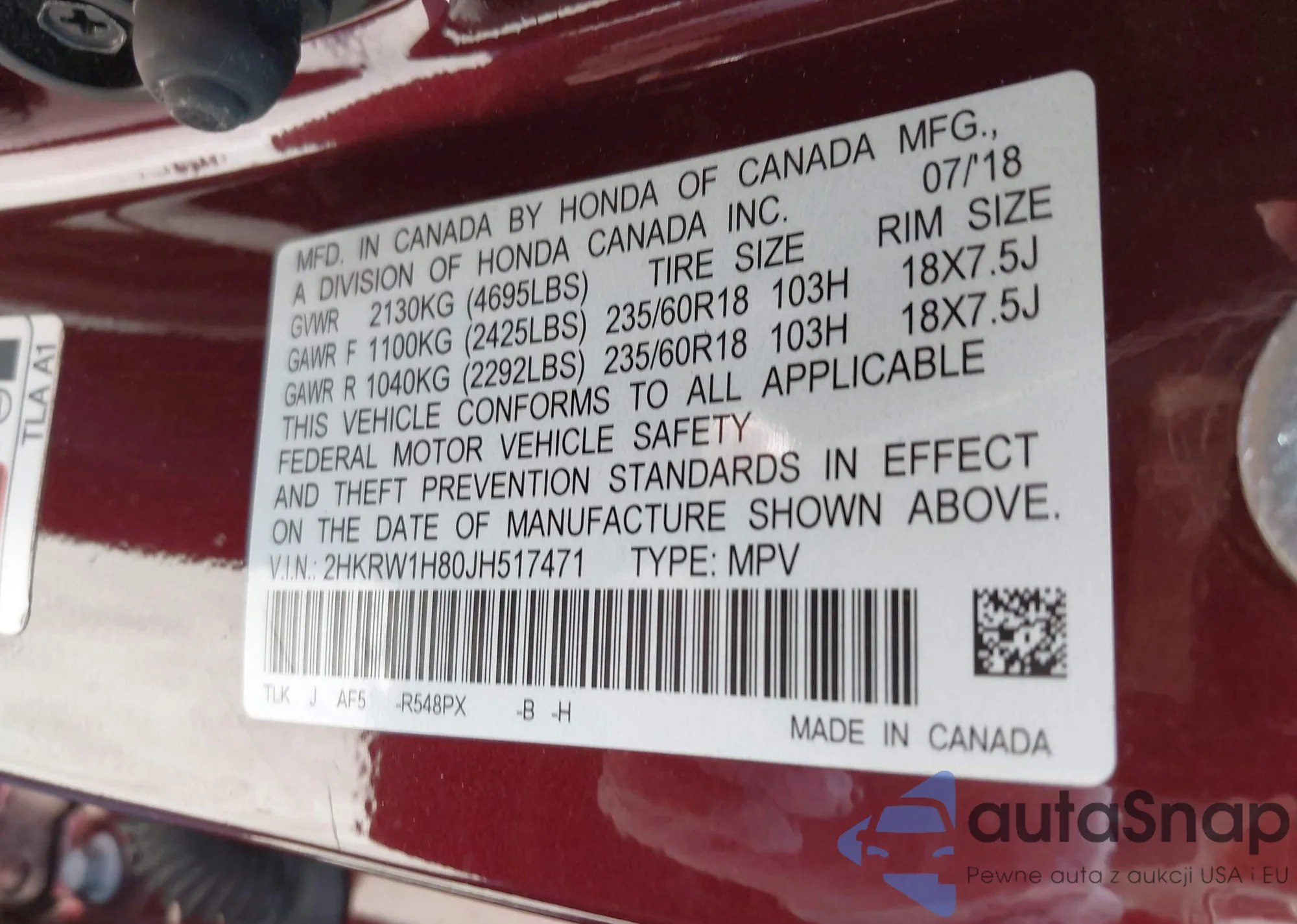 • VIN 2HKRW1H80JH517471