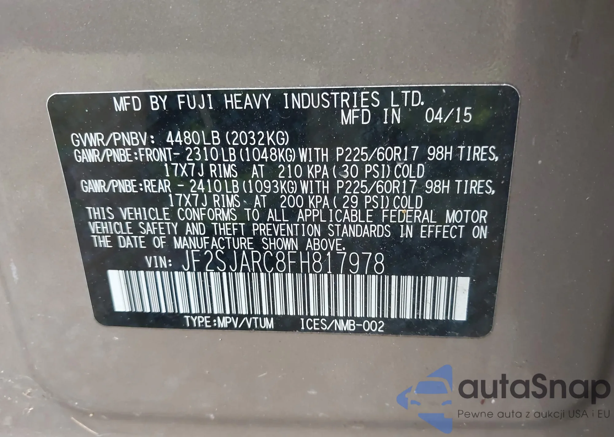 • VIN JF2SJARC8FH817978
