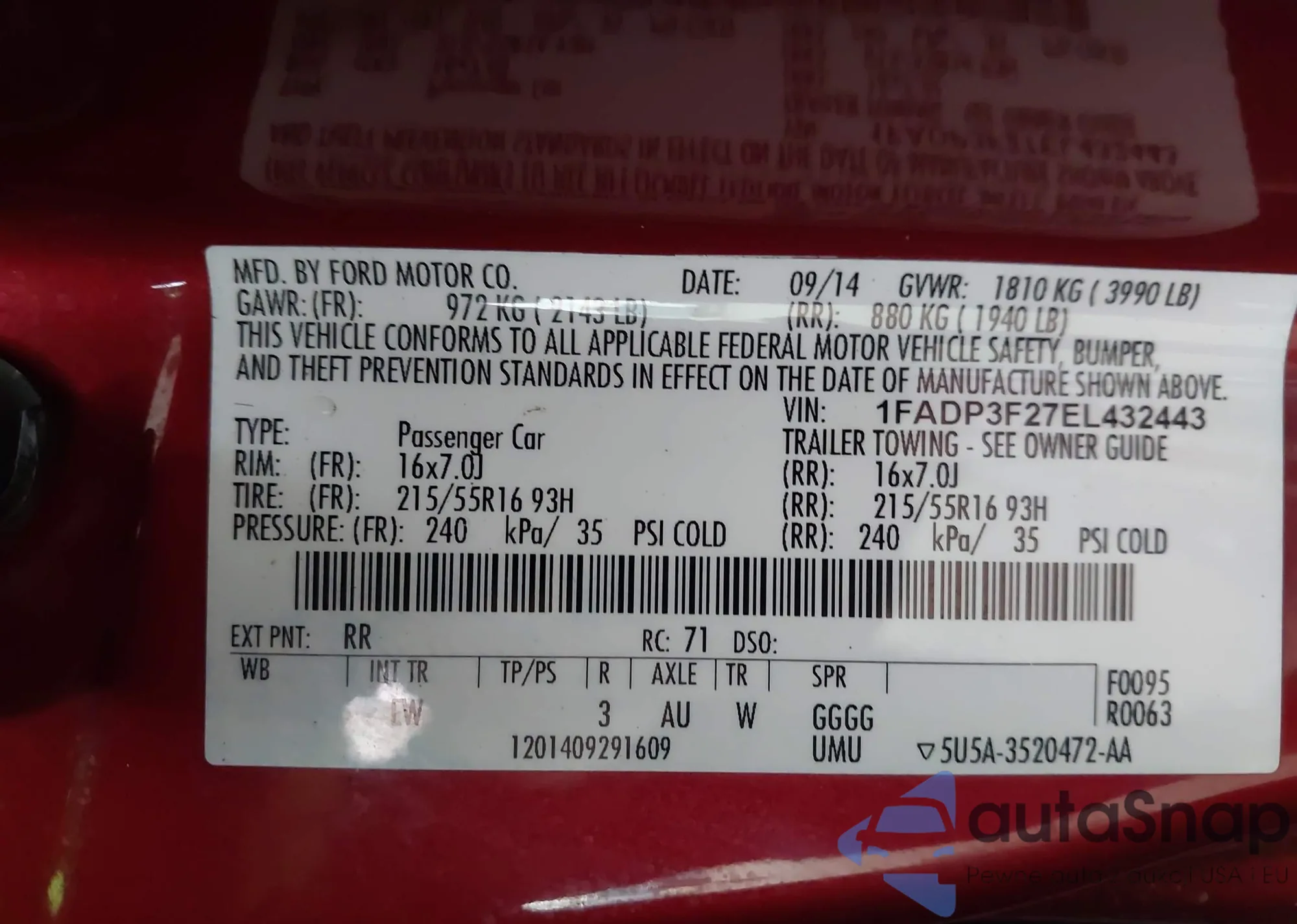 LOT: 43703067 VIN: 1FADP3F27EL432443