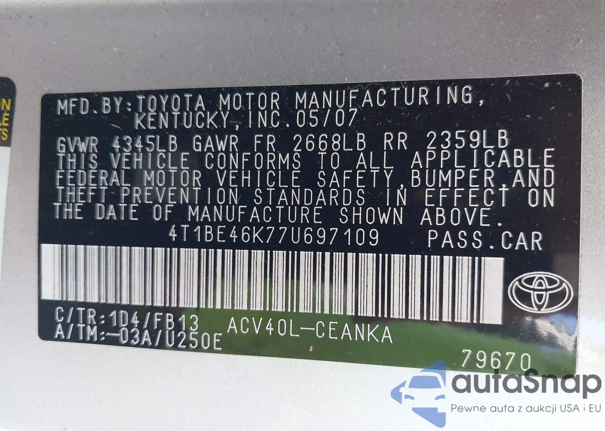LOT: 43598226 VIN: 4T1BE46K77U697109
