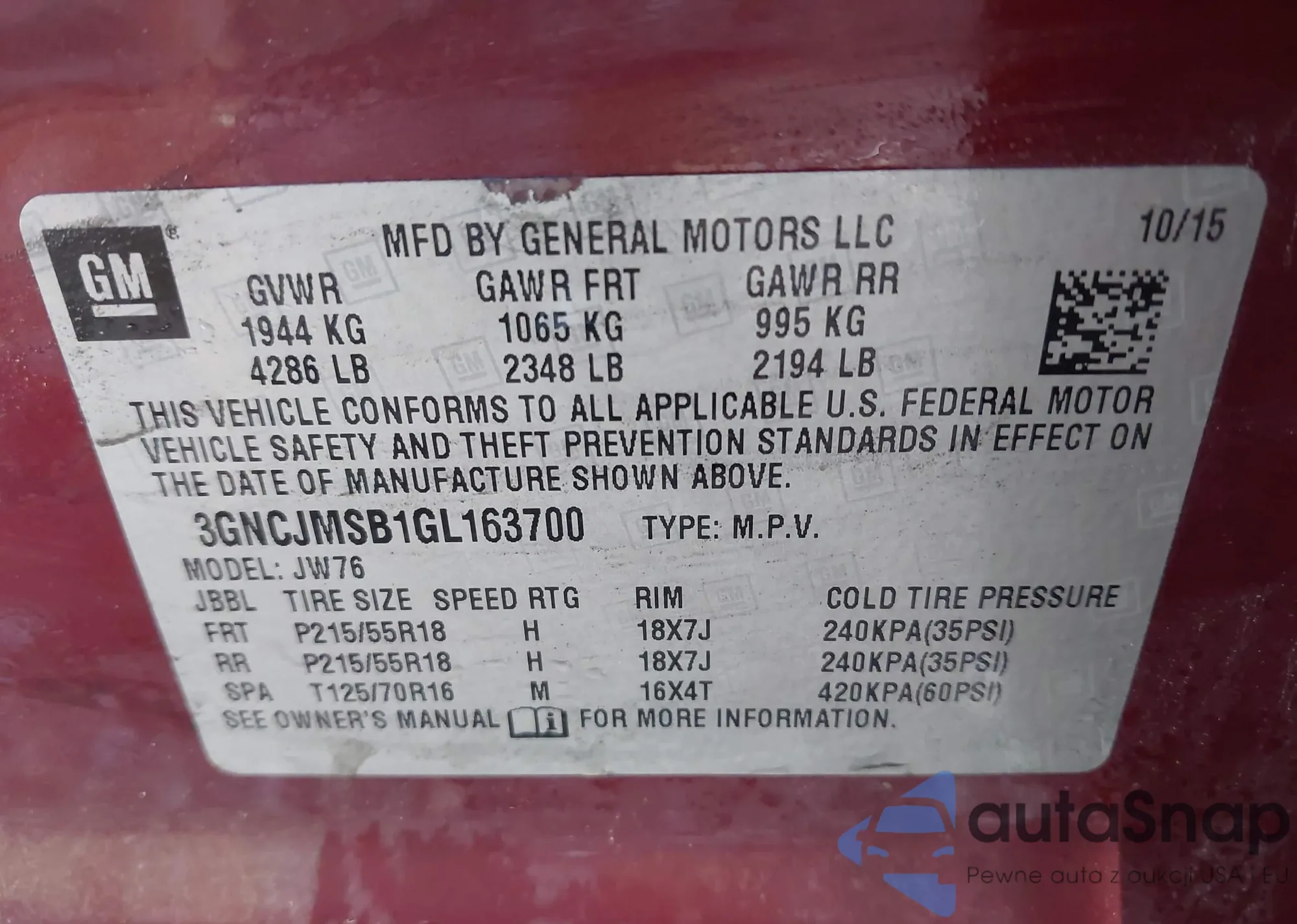 • VIN 3GNCJMSB1GL163700