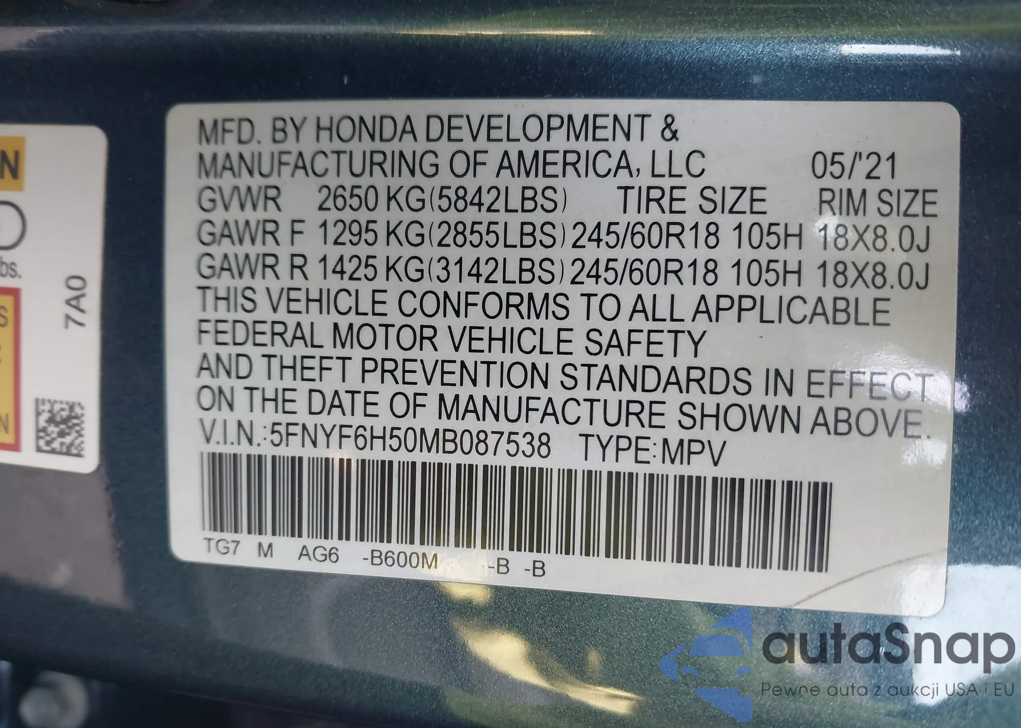 • VIN 5FNYF6H50MB087538