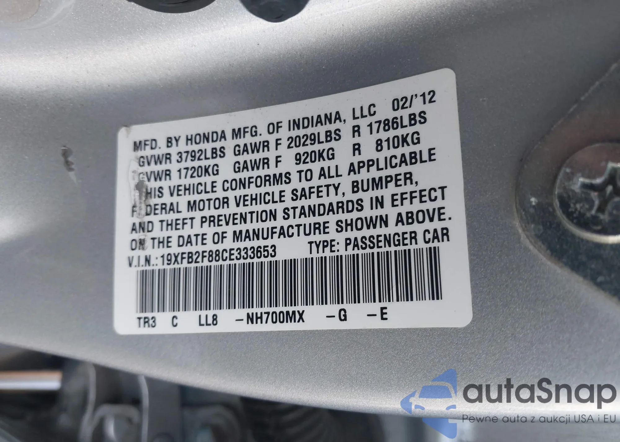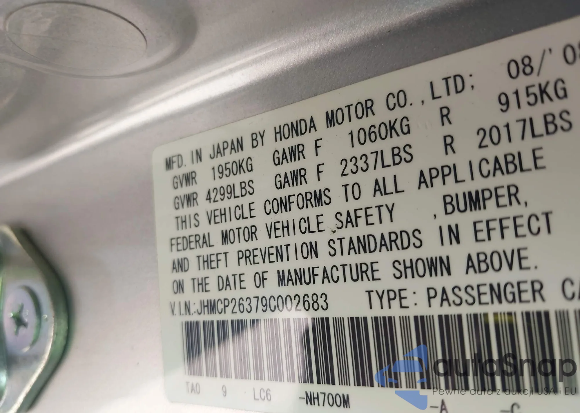 LOT: 43271870 VIN: JHMCP26379C002683