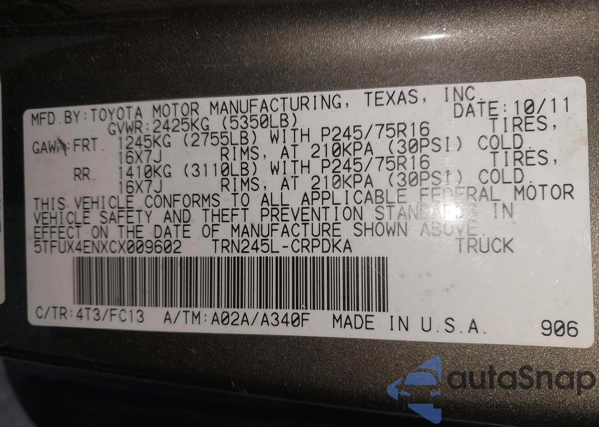• VIN 5TFUX4ENXCX009602