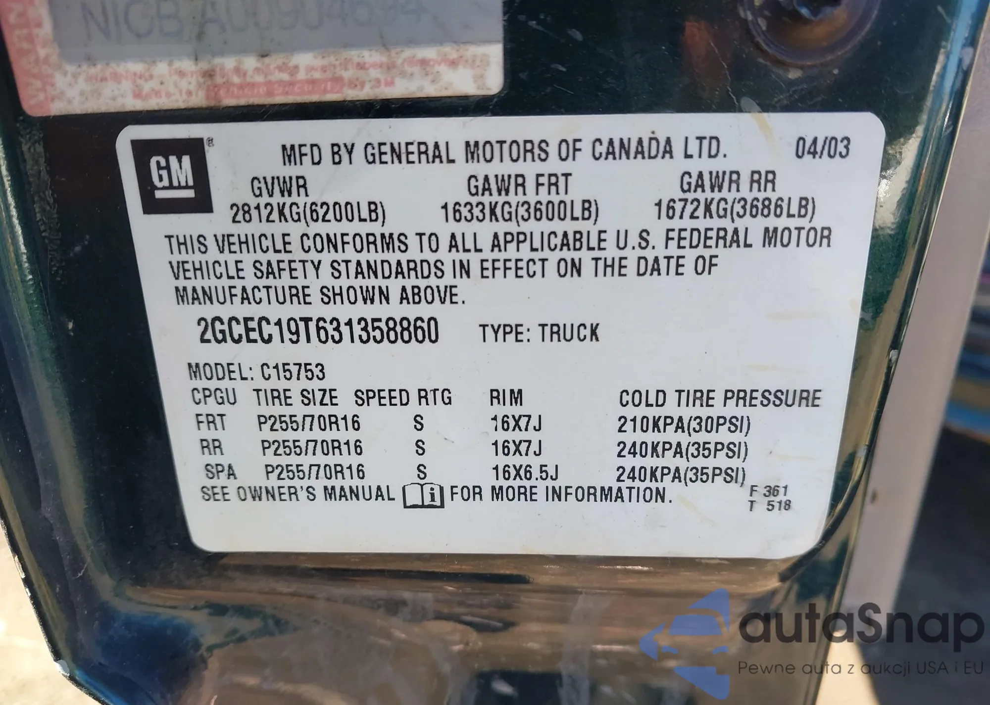 • VIN 2GCEC19T631358860