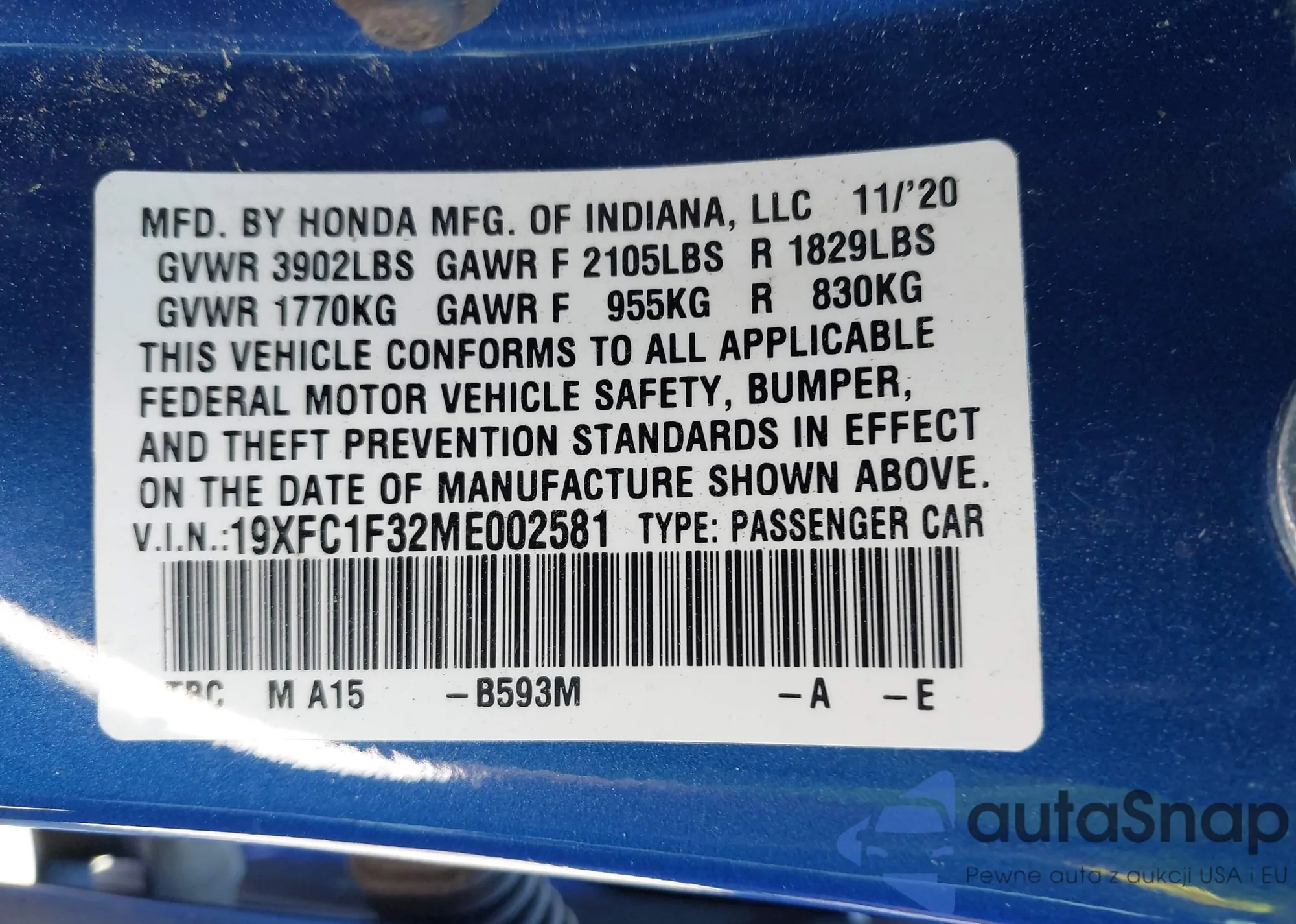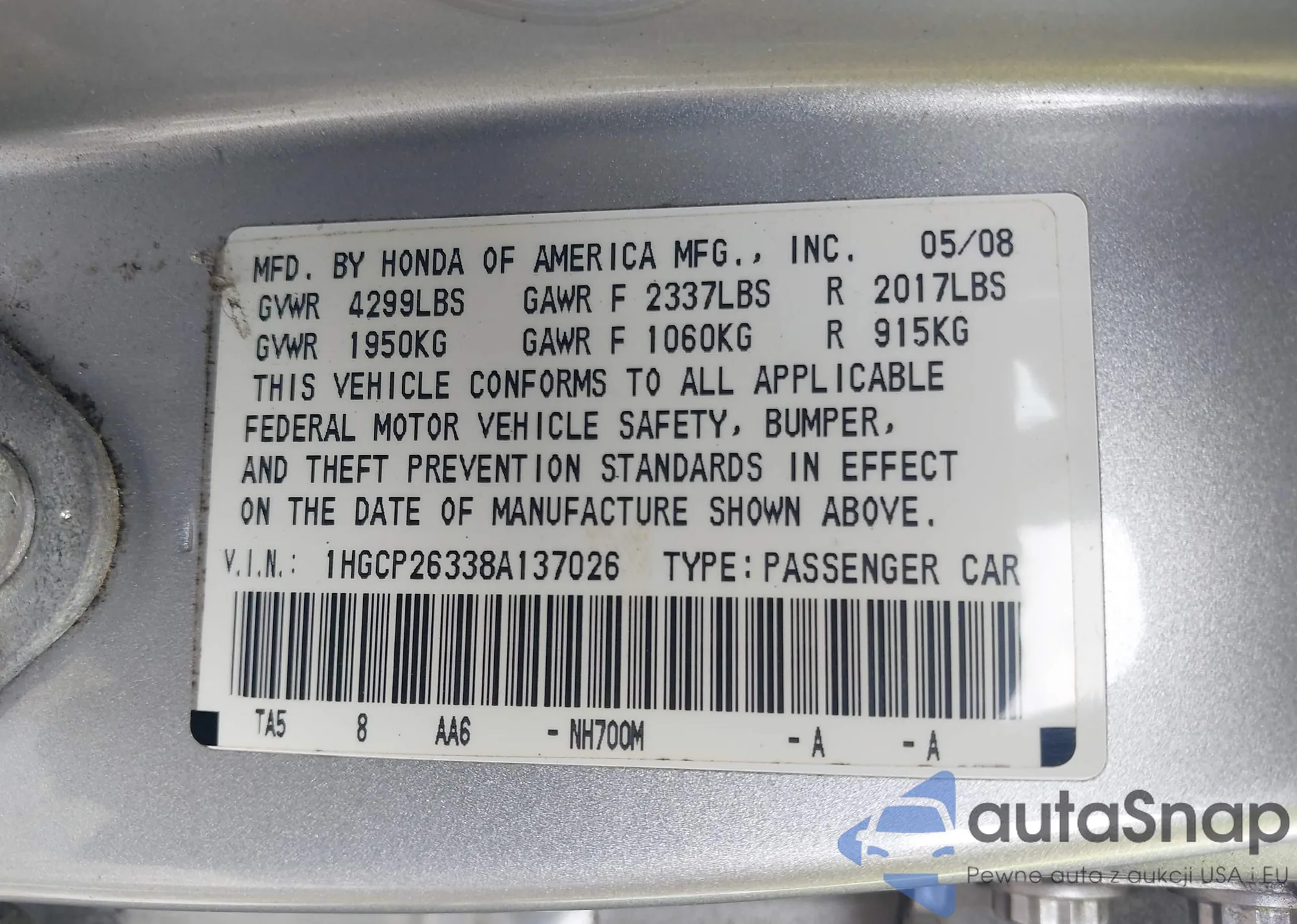 LOT: 43504006 VIN: 1HGCP26338A137026