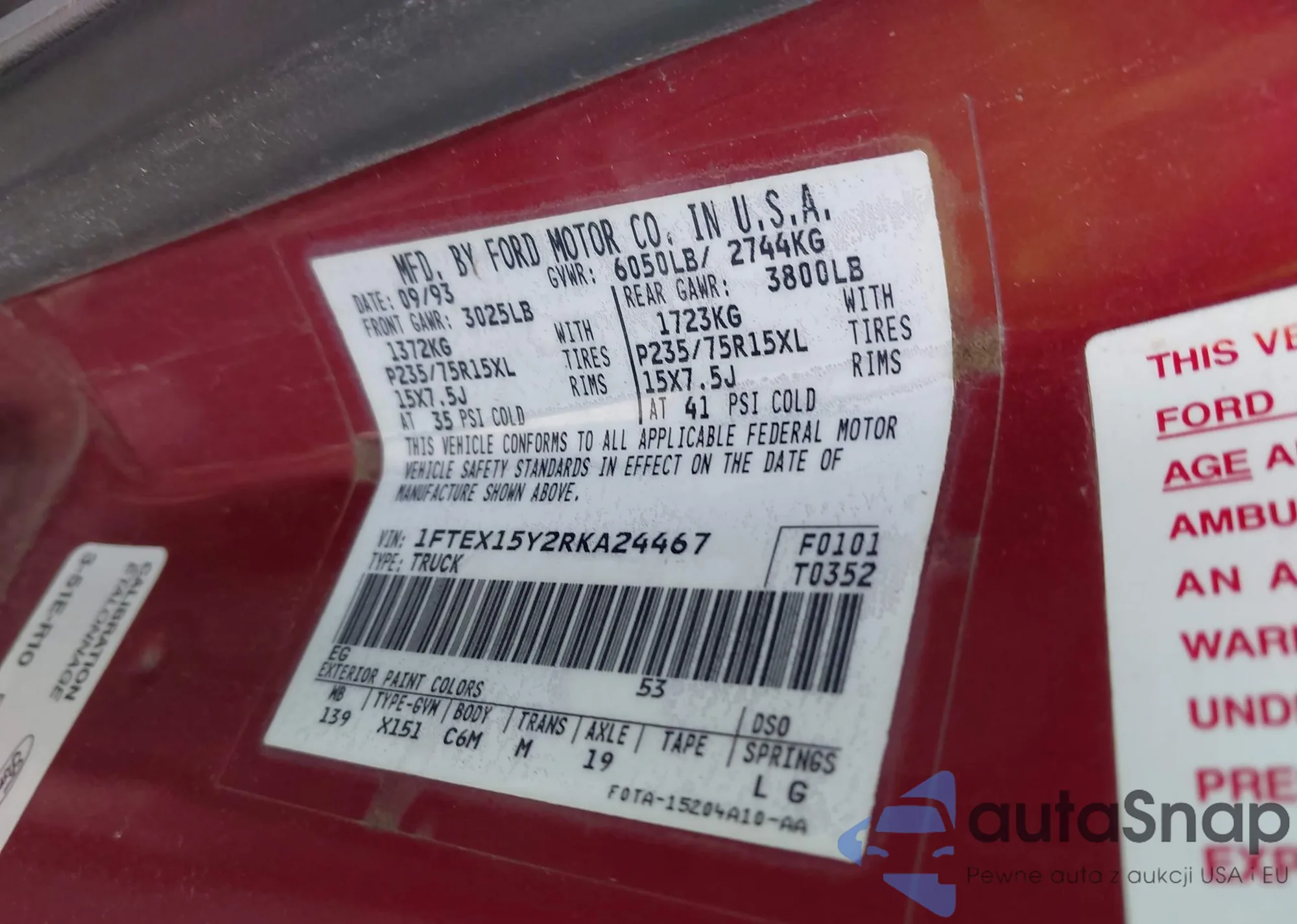 1994 Ford F150 z USA, uszkodzony, nr VIN 1FTEX15Y2RKA24467