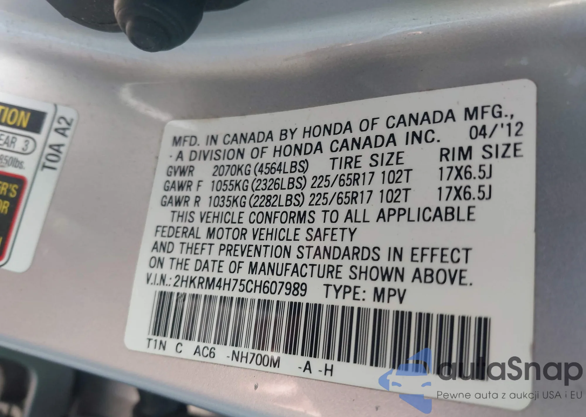• VIN 2HKRM4H75CH607989