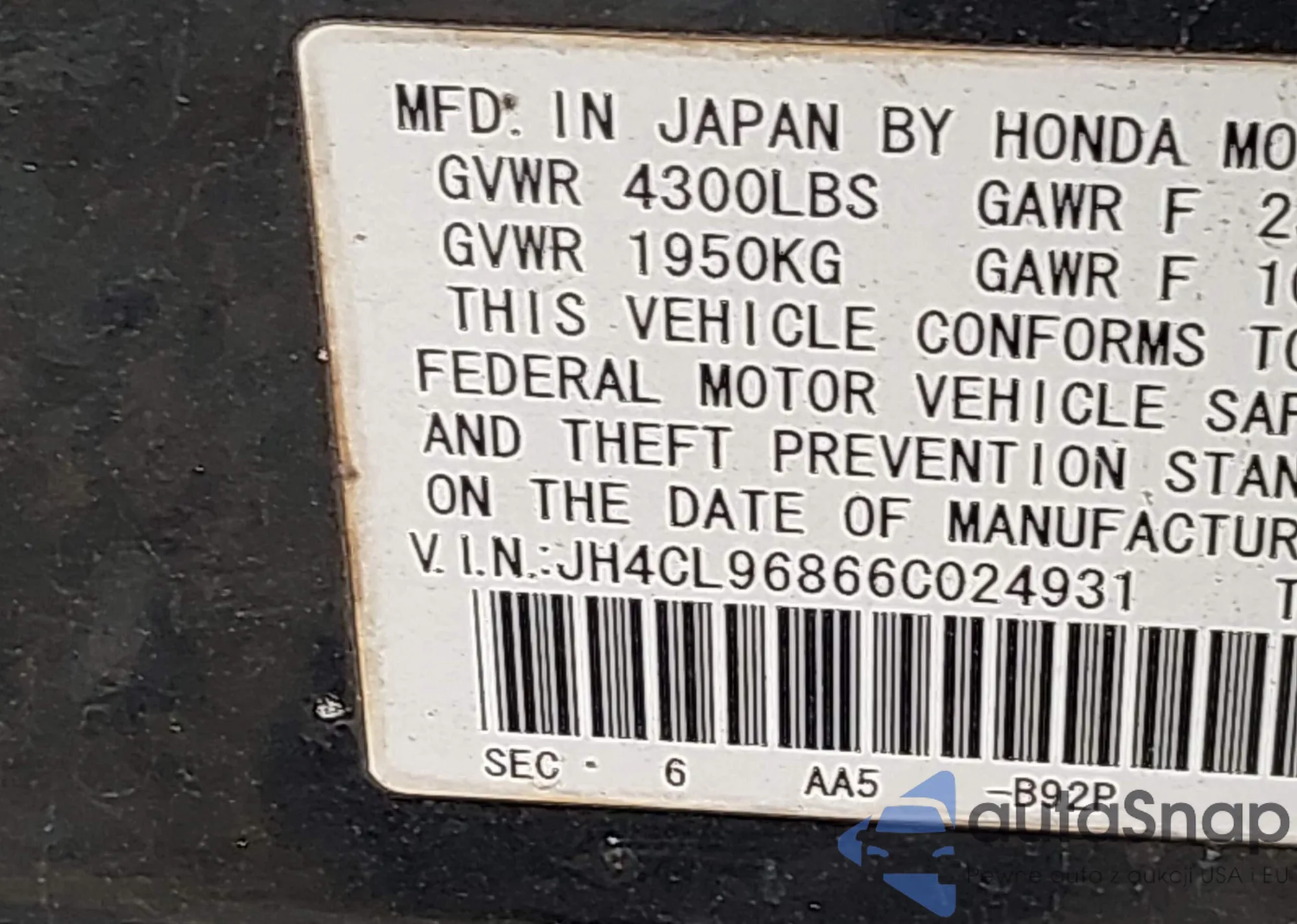 • VIN JH4CL96866C024931