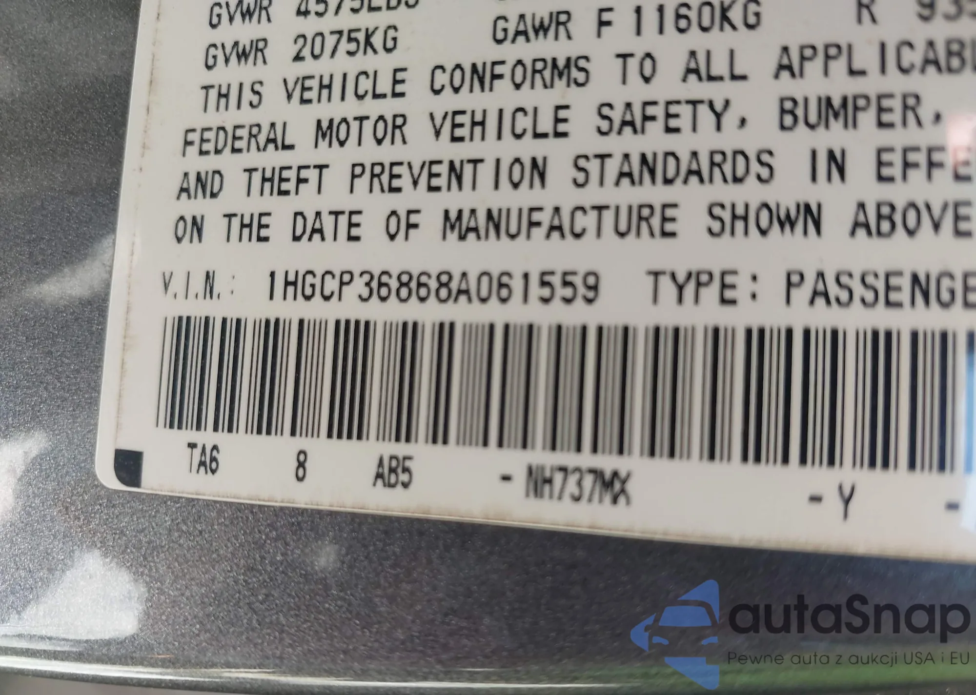 LOT: 40536150 VIN: 1HGCP36868A061559