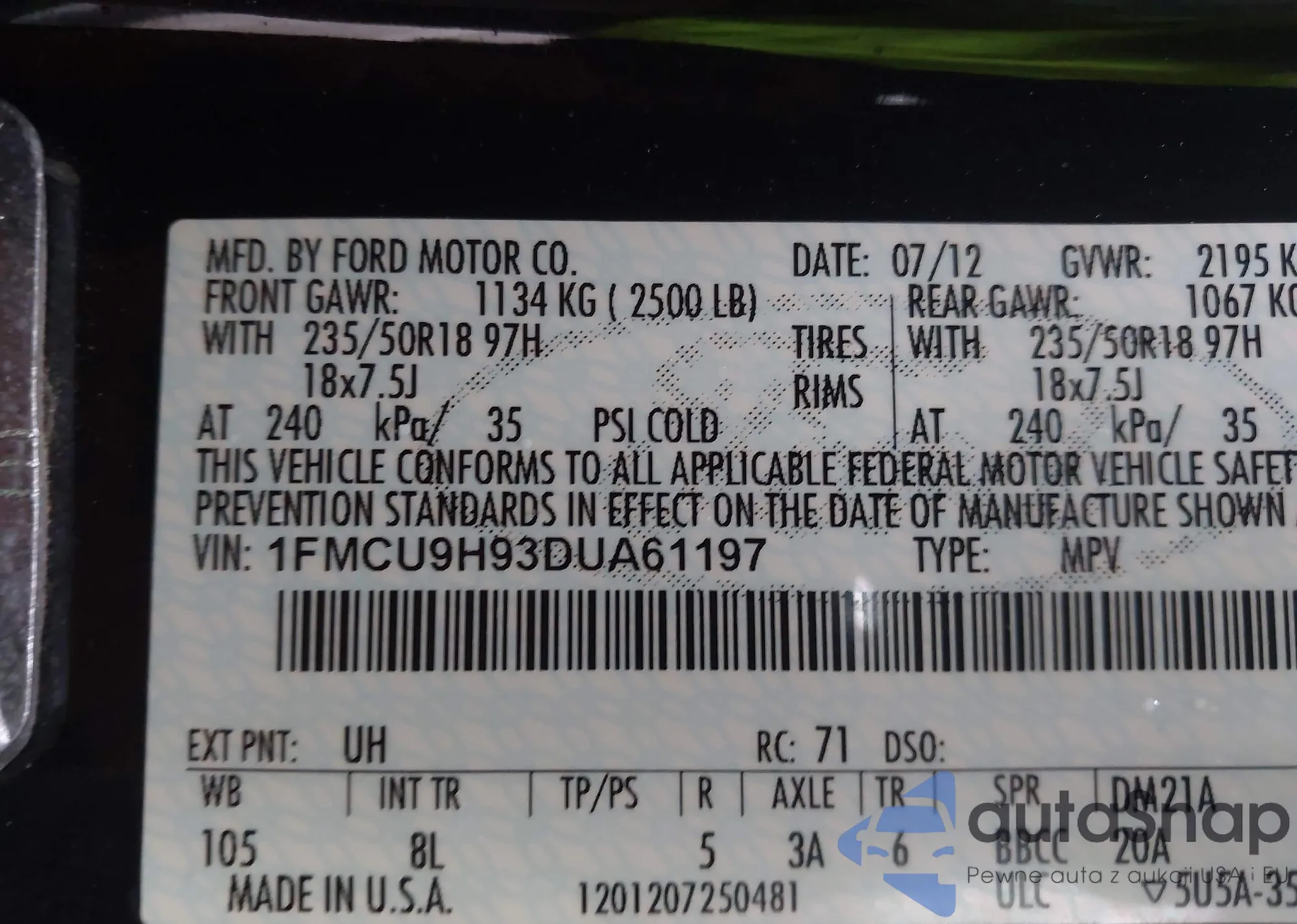 • VIN 1FMCU9H93DUA61197