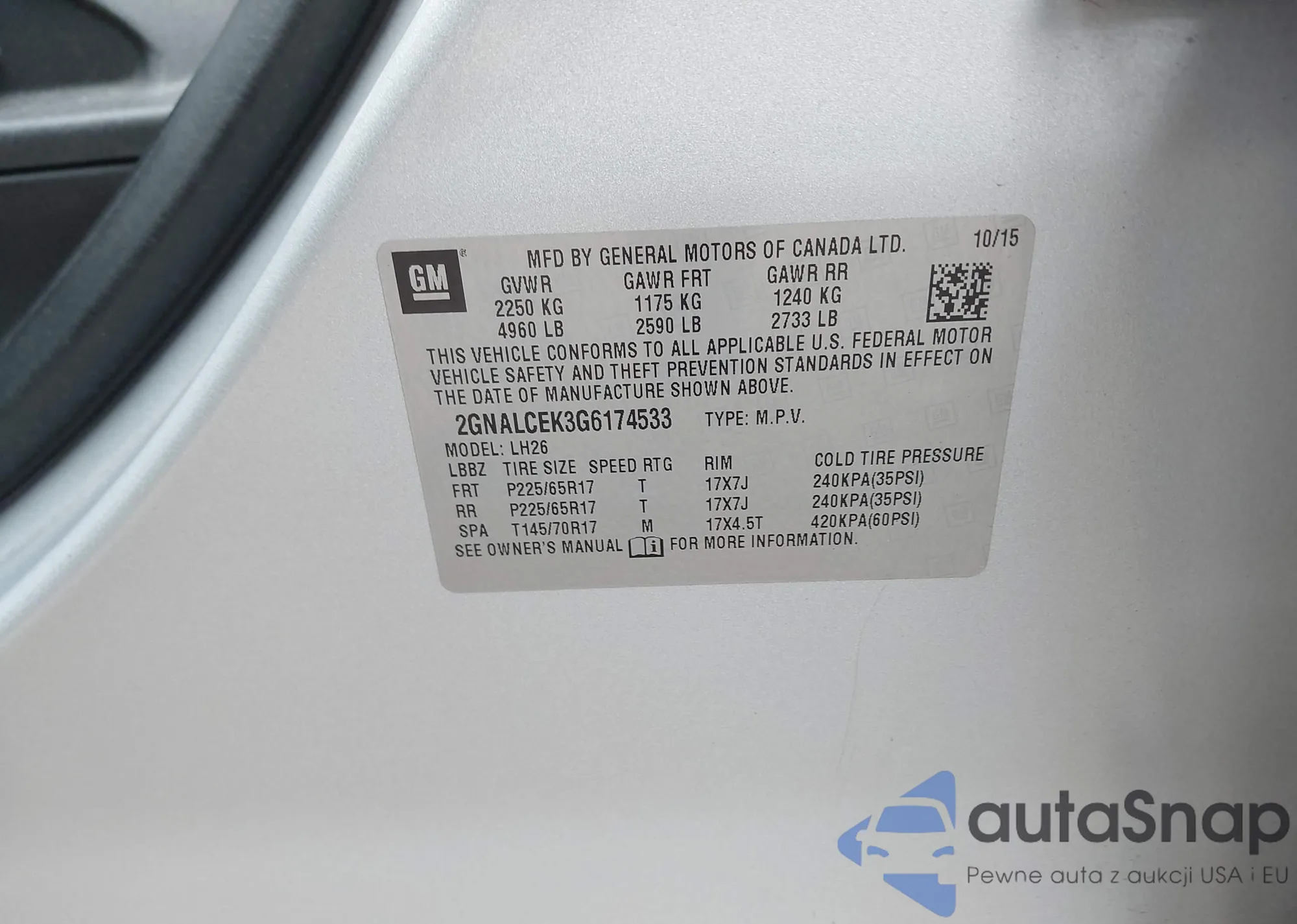 LOT: 43558144 VIN: 2GNALCEK3G6174533