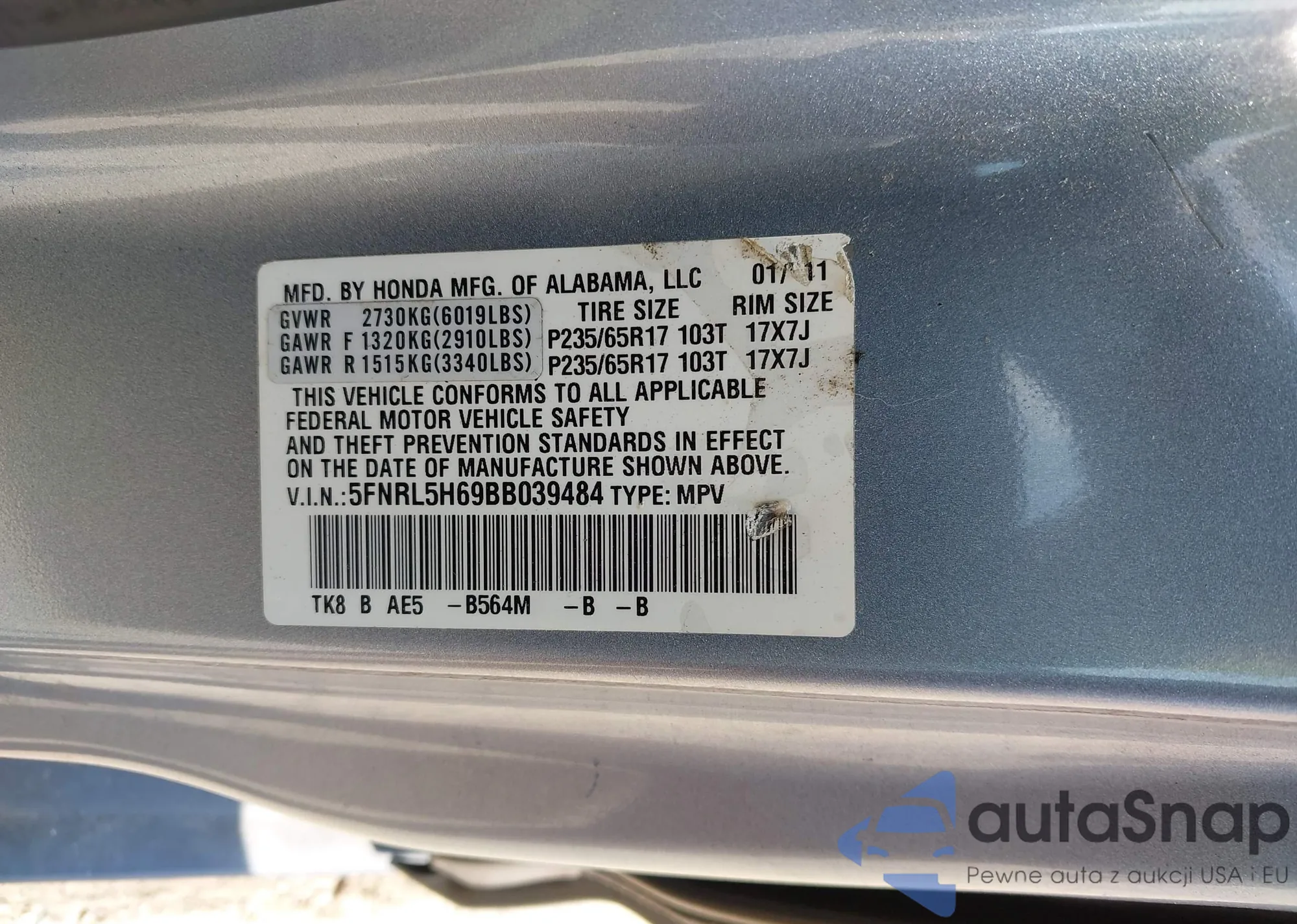 • VIN 5FNRL5H69BB039484